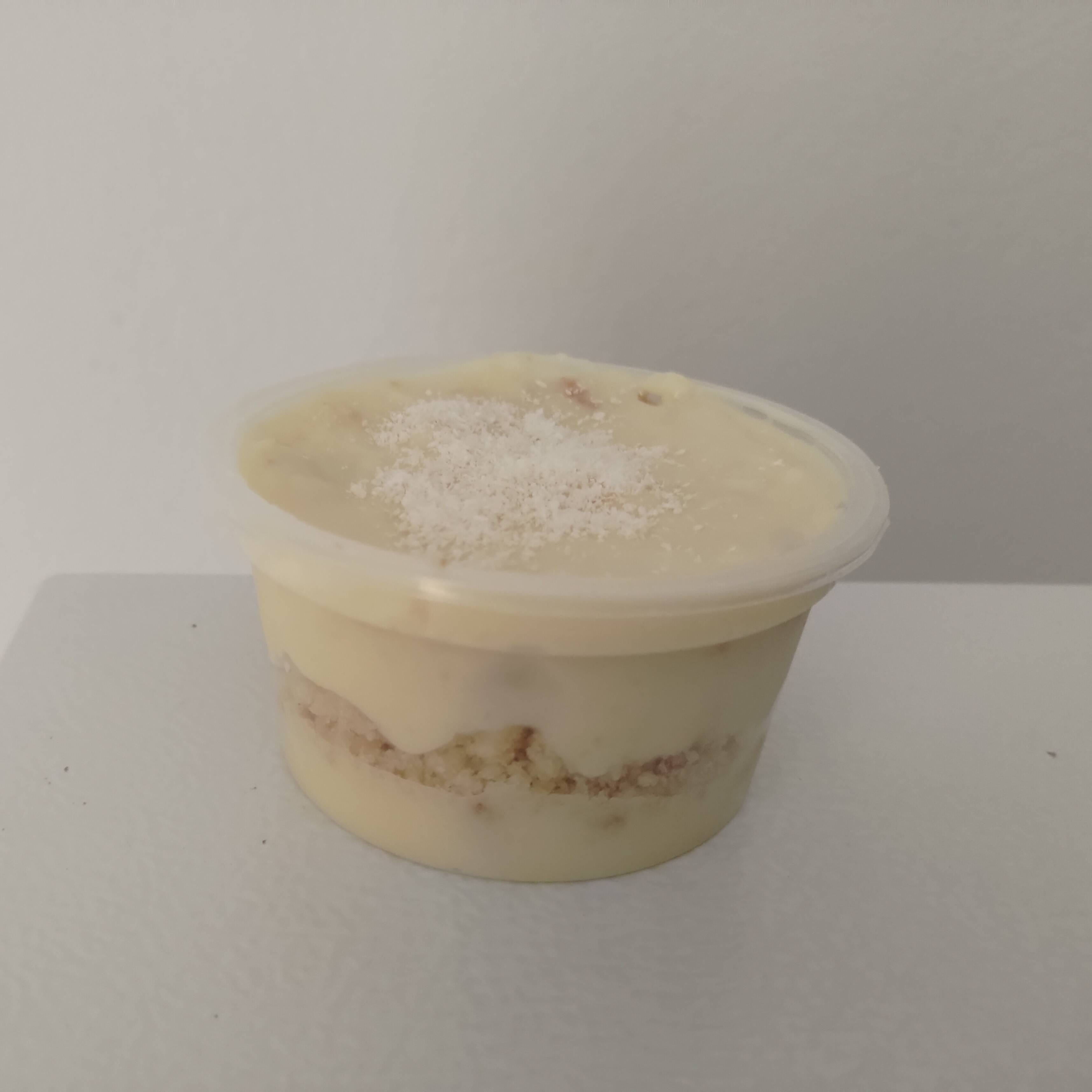 Creme de ninho com abacaxi cremoso, com chamadas de biscoito maisena e como cobertura chantilly com coco ralado.