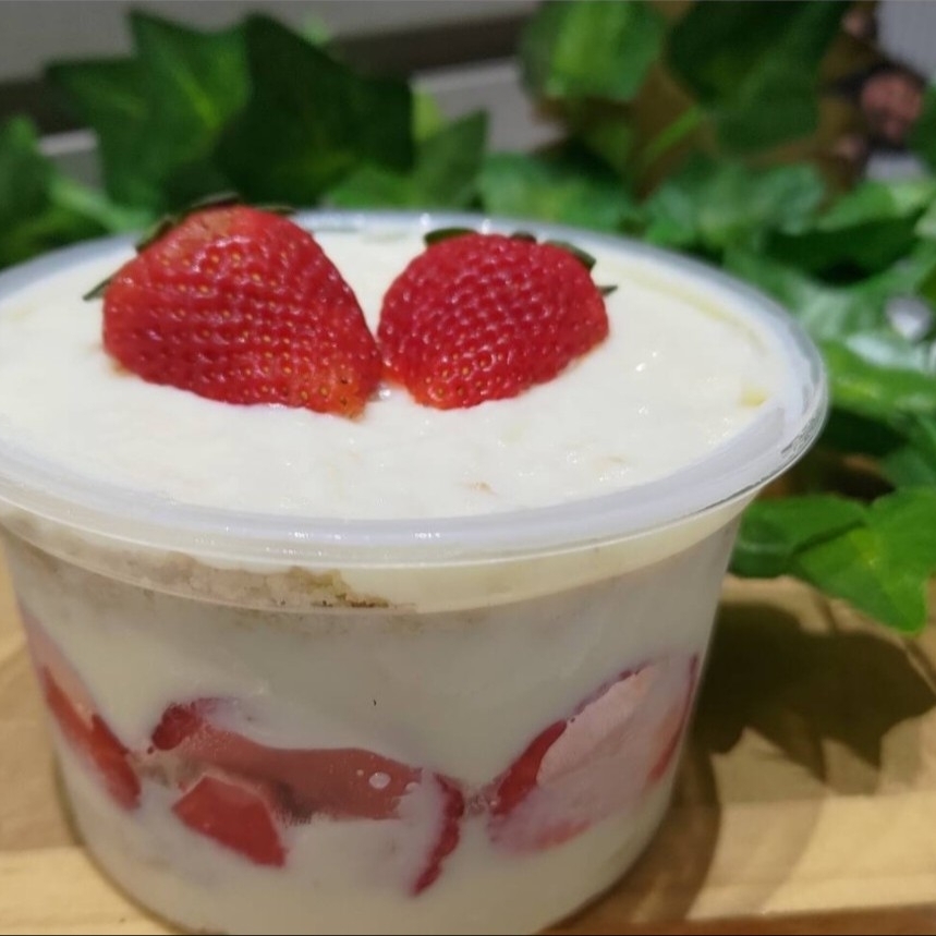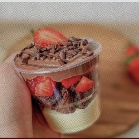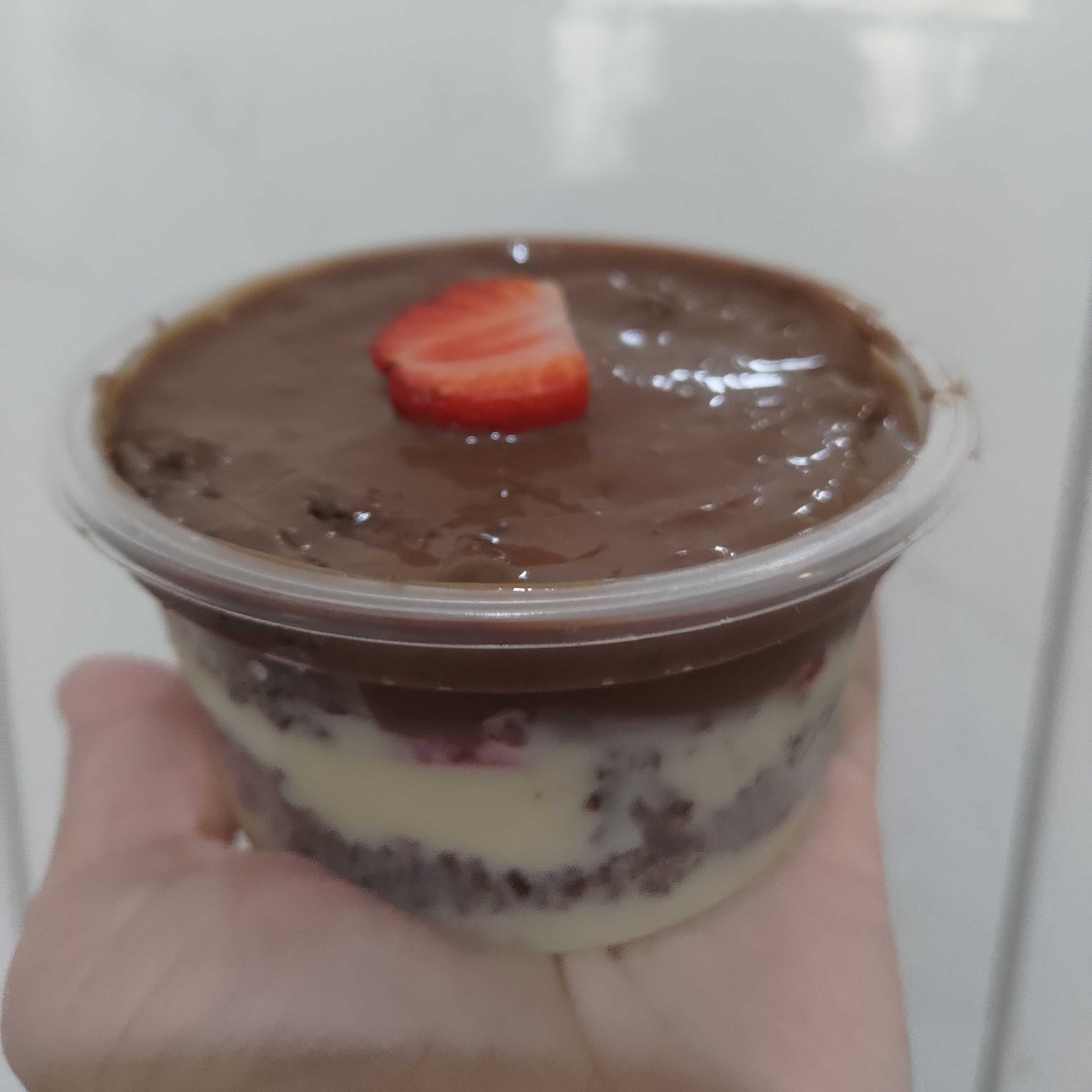 Camadas de creme de ninho, brownie, morangos e chocolate