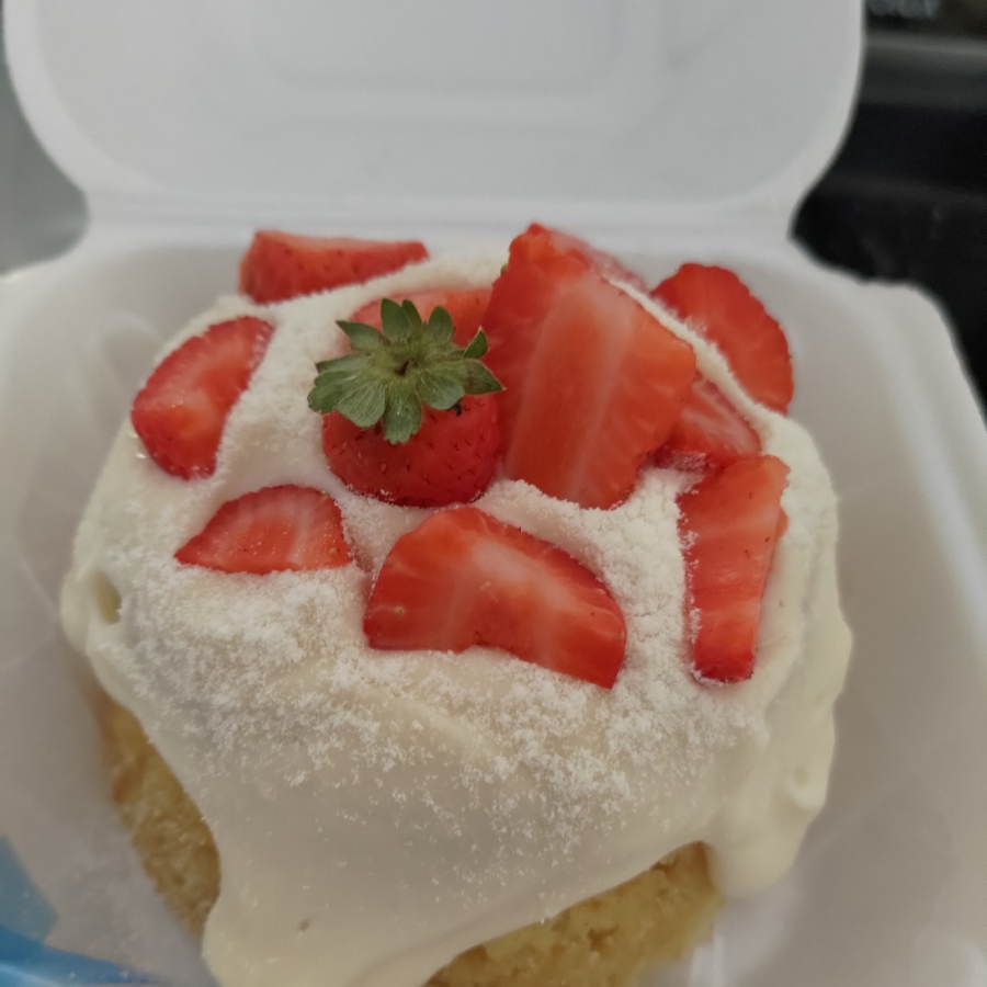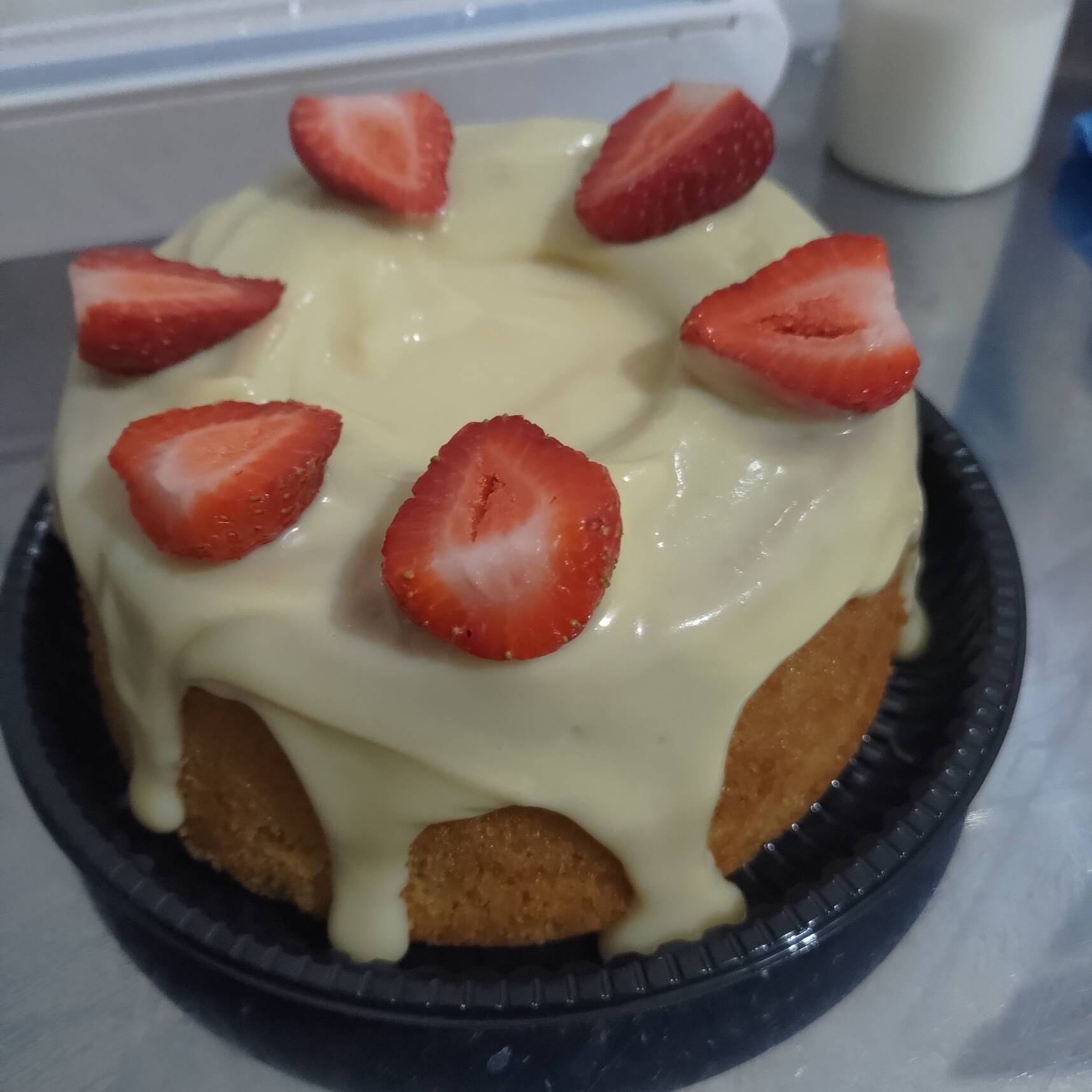Bolo artesanal massa fofinha de baunilha com cobertura e recheio de ninho e pedaços de morango
