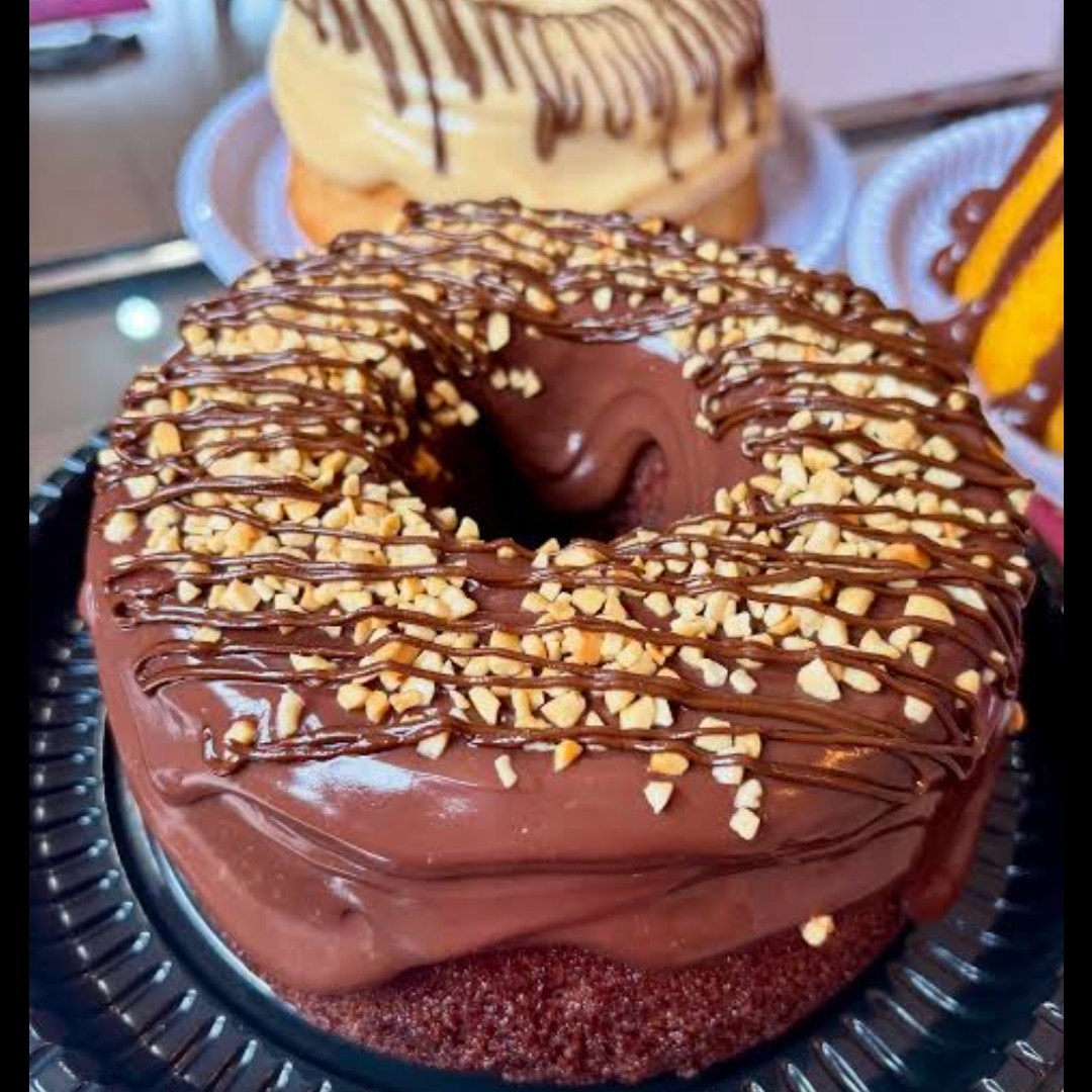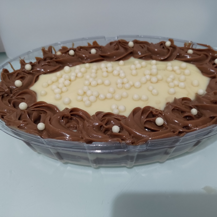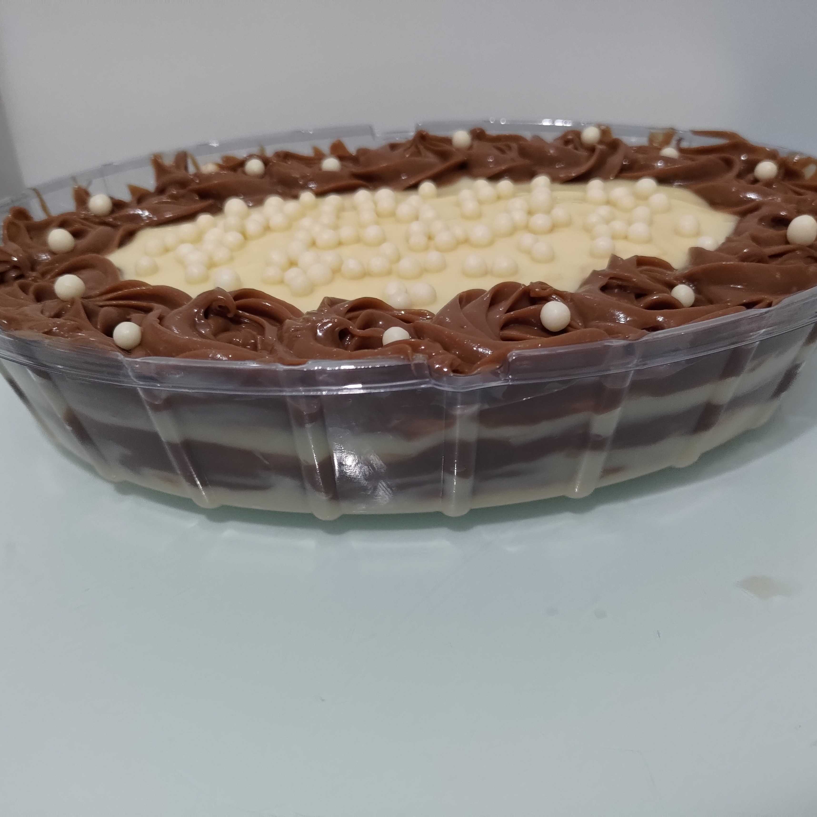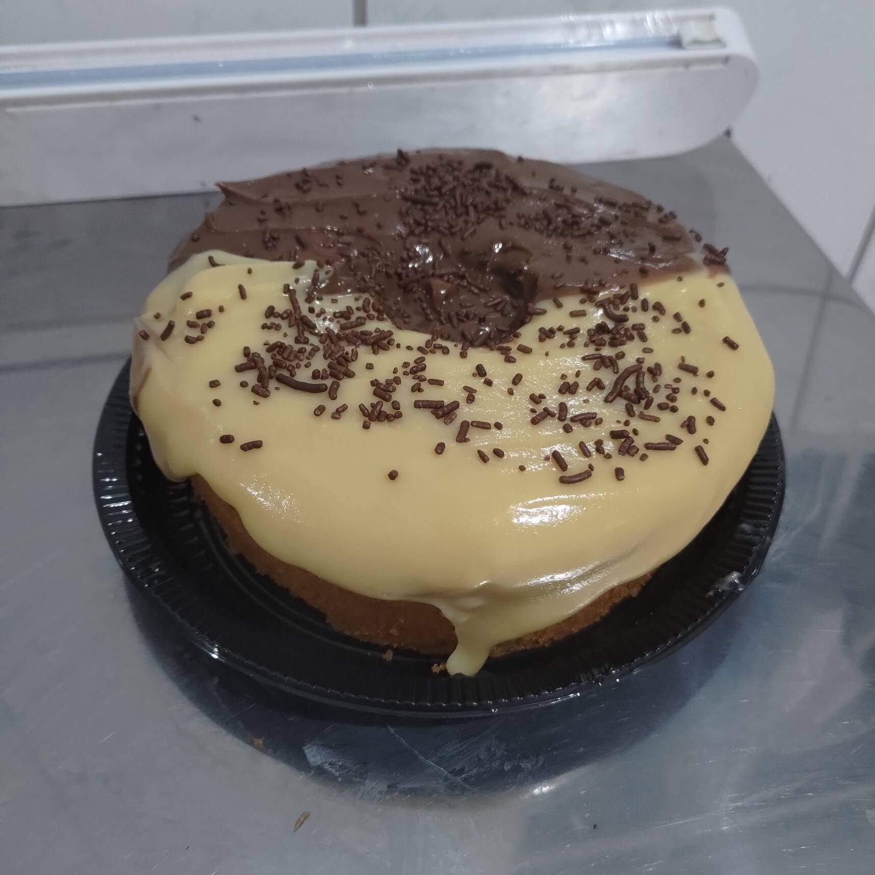 Bolo feito com massa de chocolate 50% cacau ou baunilha, com cobertura de creme de ninho e chocolate, pesando 700g