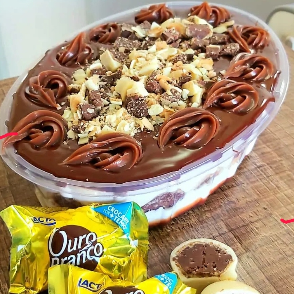 Camadas de creme de ninho e chocolate 50% cacau e pedaços de bombom ouro branco