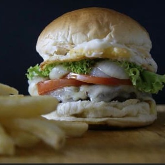 Pão, carne, queijo, bacon, ovo, batata palha, alface e tomate
