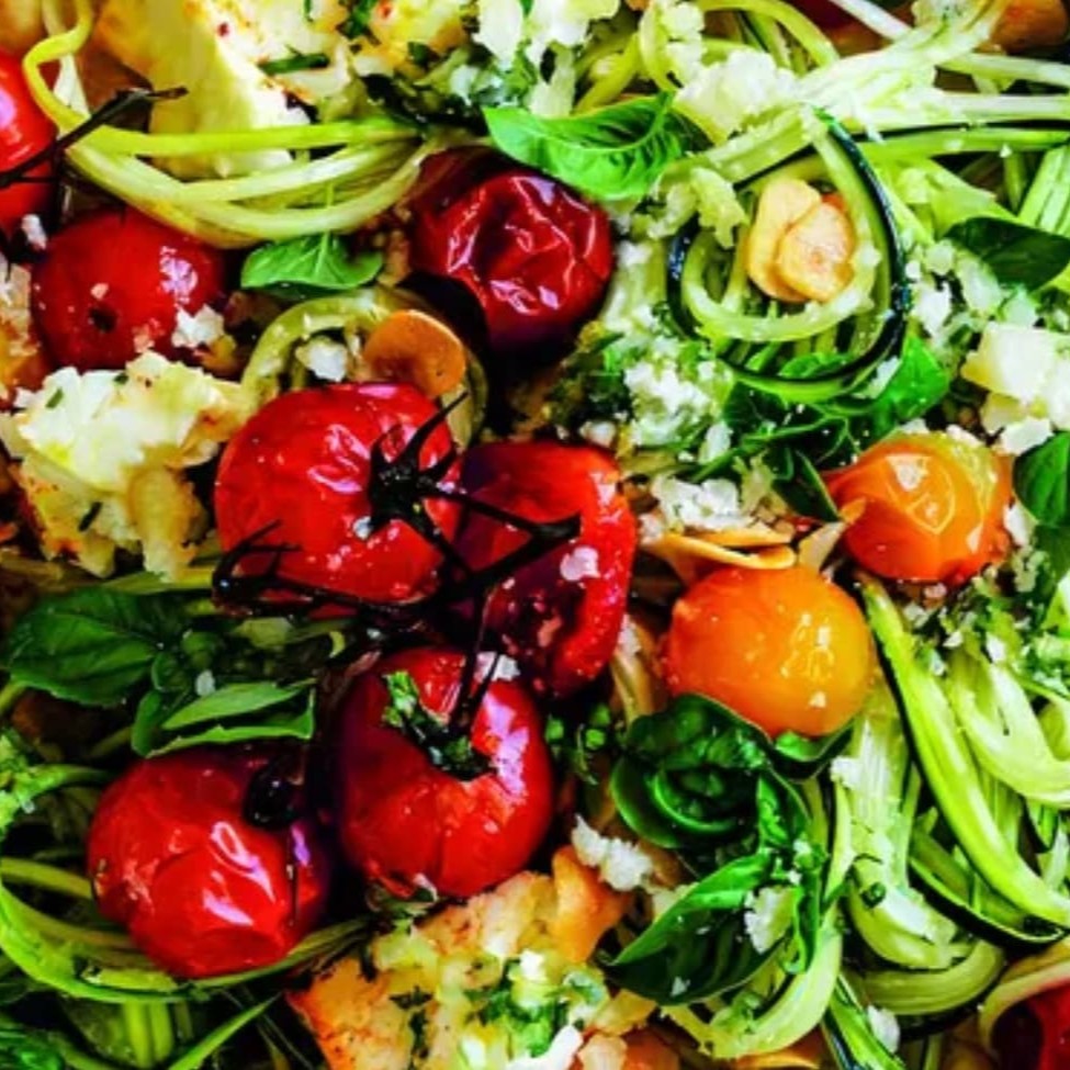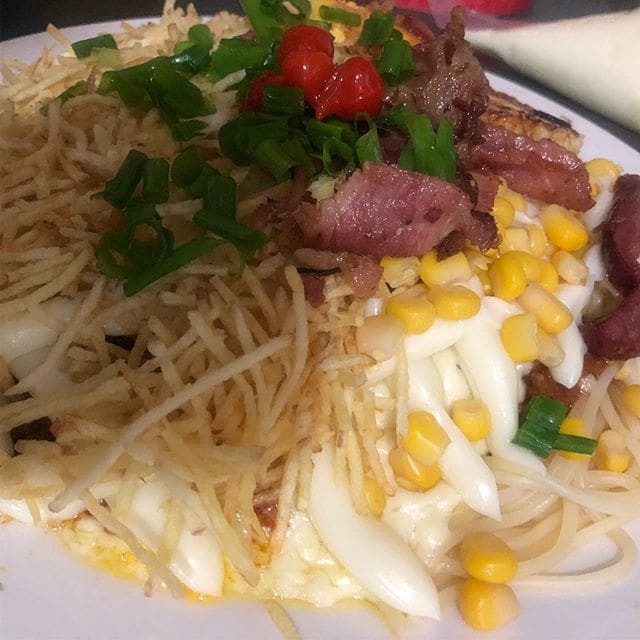 Macarrão, bacon, linguiça, milho, tomate, repolho, queijo mussarela, cenoura, cebola.