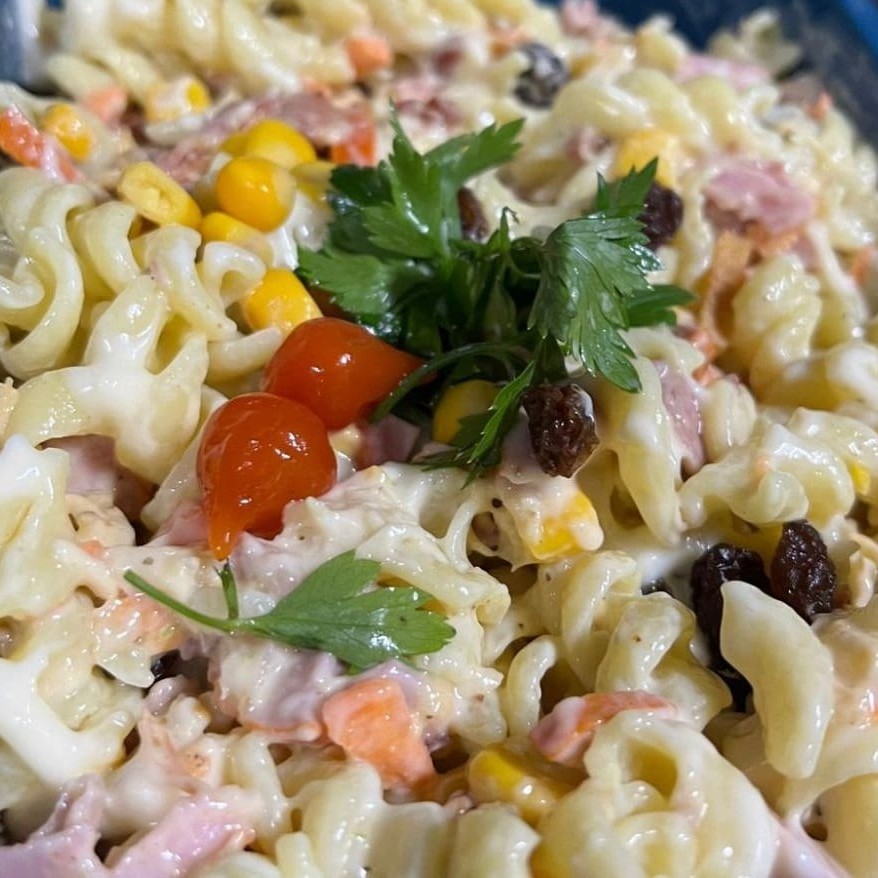 Delicioso macarrão parafuso com maionese da casa, cenoura, milho, bacon, frango desfiado e passas
