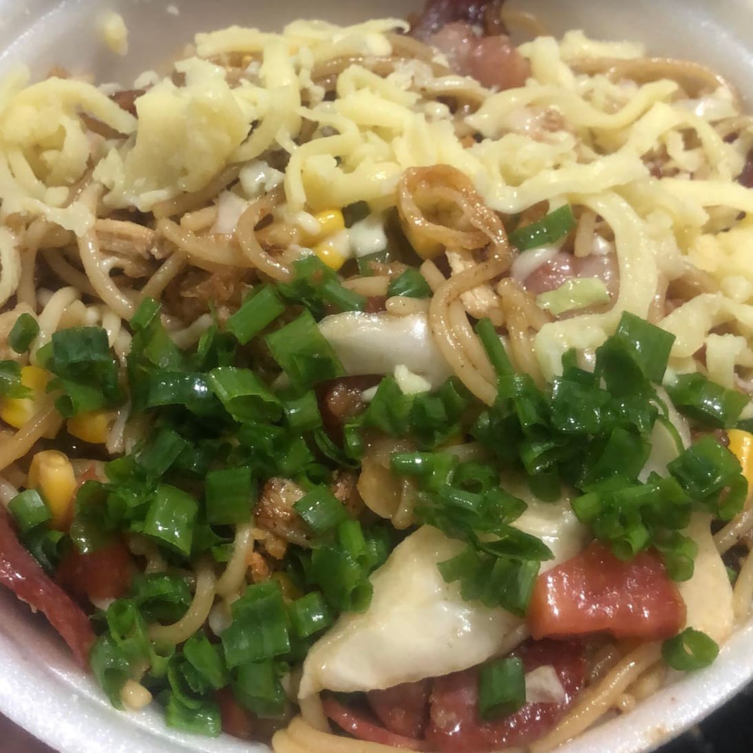 Espague-tudo: espaguete, molho à bolonhesa, mussarela, ovo frito, bacon, Catupiry, batata palha, milho e cebolinha. Tags: massa. Macarrão. Espaguete, molho quente. Hot.