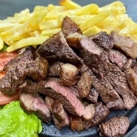 Contra -filé com fritas: 850g +100g queijo (na chapa) 300g de filé 500 g de fritas Mais queijo e bacon