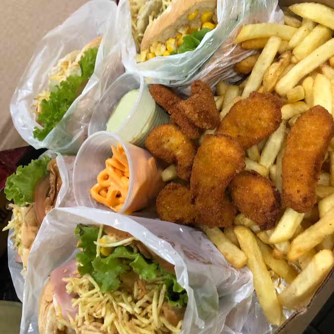 X- frango: pão, carne de frango, presunto, queijo, frango desfiado, Catupiry, milho, batata palha, alface e tomate