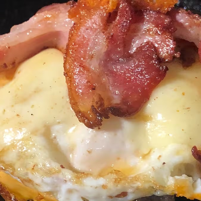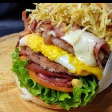 Blend de 160 g, queijo cheddar, queijo mozarela , ovo, bacon, molho especial, alface e tomate, acompanha 1/2 kg de batata sequinha.