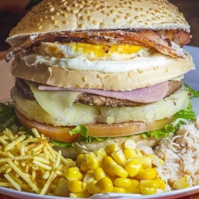 Dogão burguer: pão, duas carnes, queijo, presunto, ovo, bacon, cheddar, abacaxi, milho, batata palha, alface e tomate