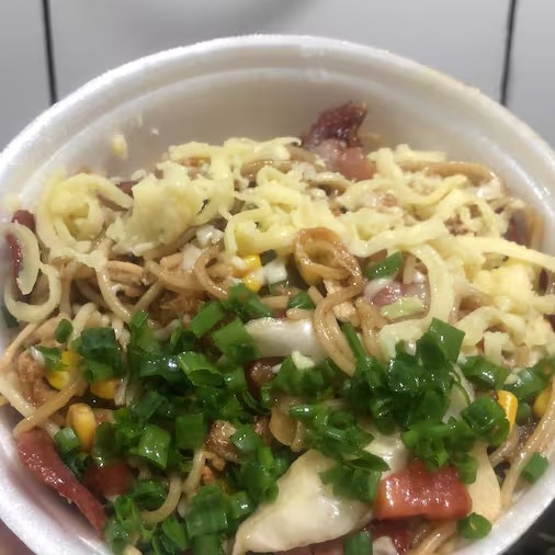 Macarrão, bacon, linguiça, milho, tomate, repolho, queijo mussarela, cenoura, cebola.