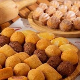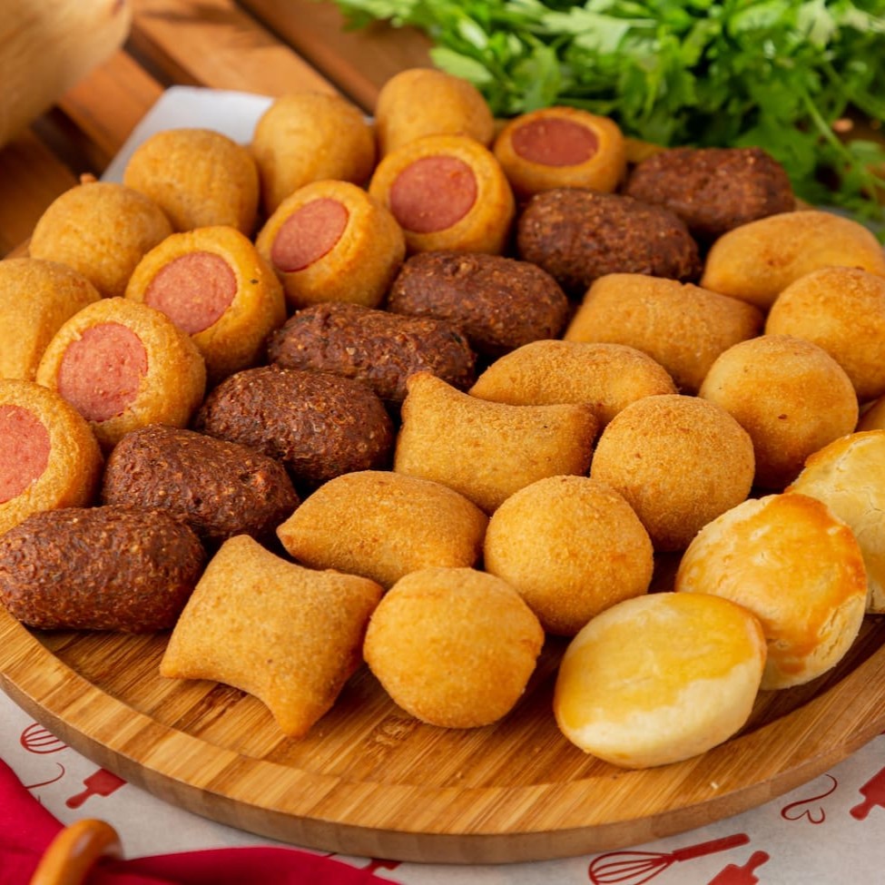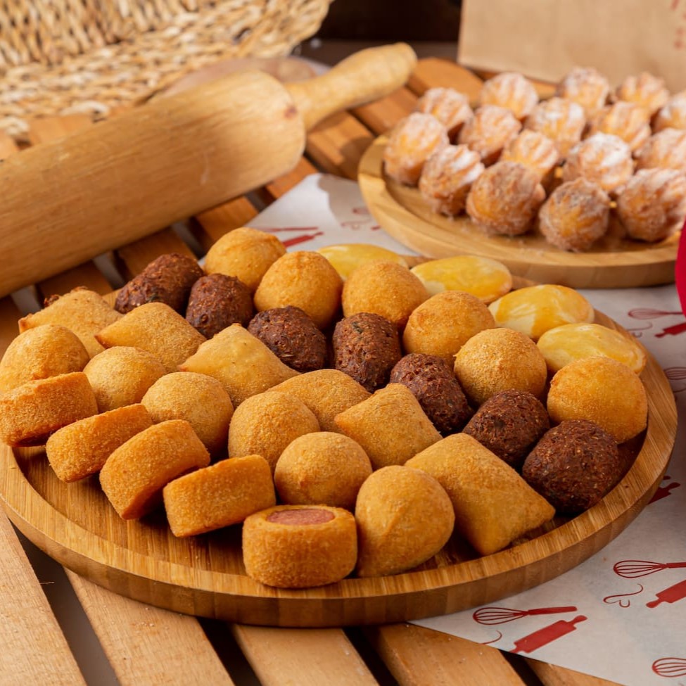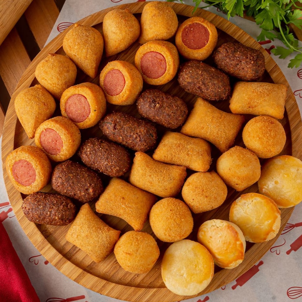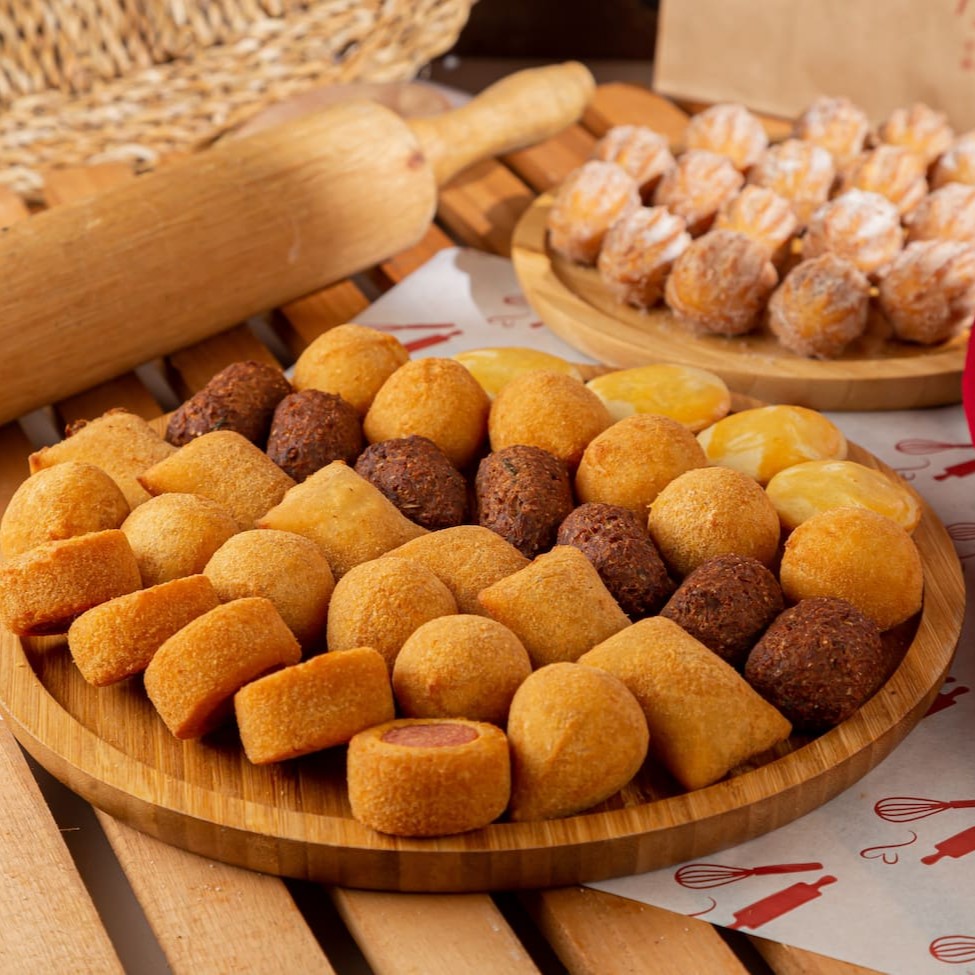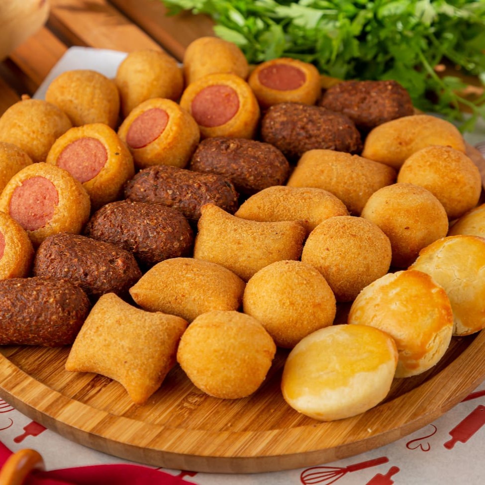 Mini salgado fritos tamanho festa com diversos sabores disponíveis. Este combo exclusivo permite a escolha de até 4 sabores. Tamanho médio de 20g. Média de 10 unidades por pessoa.