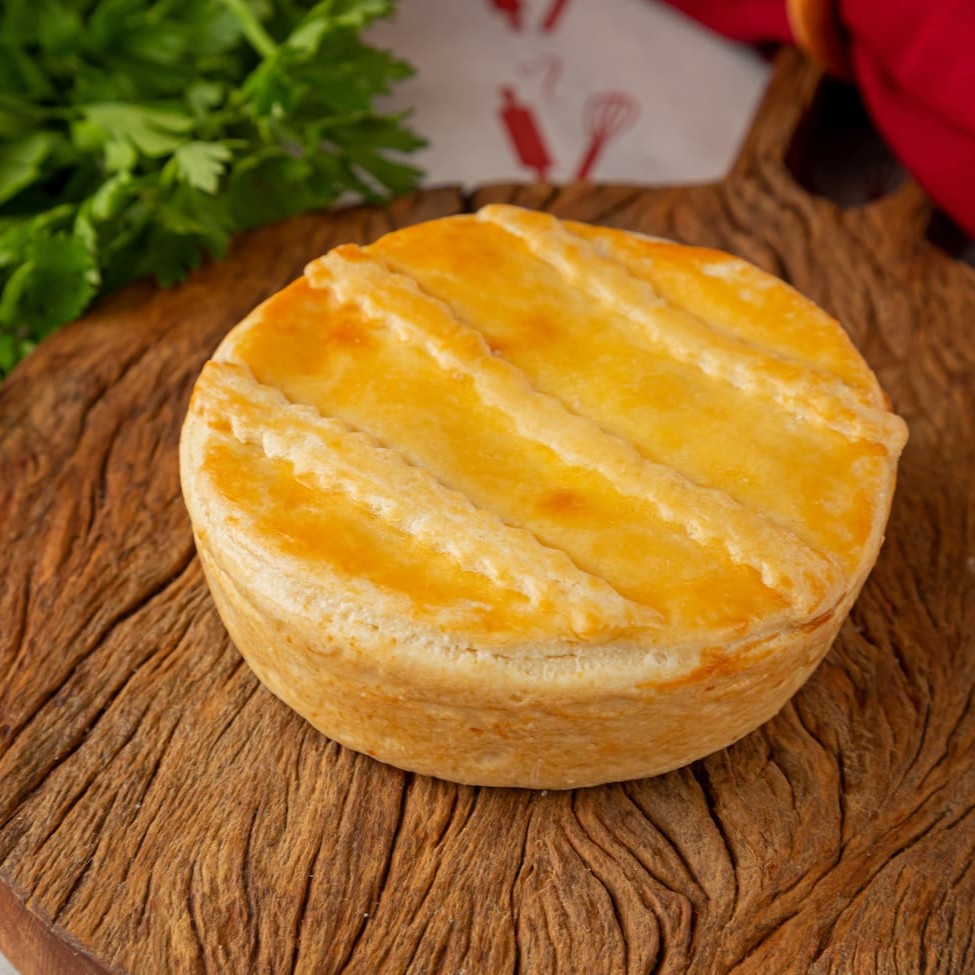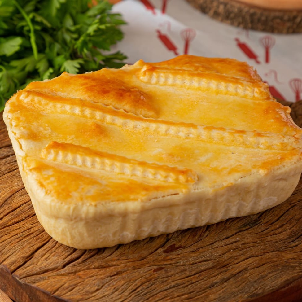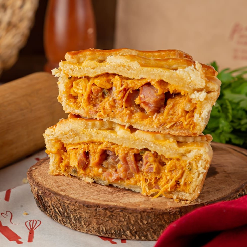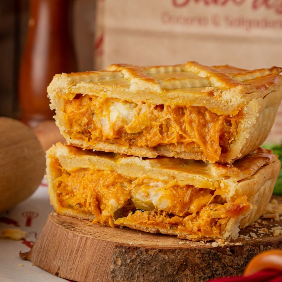Delicioso empadão com massa caseira, crocante e sequinha, recheado com frango suculento e requeijão cremoso.