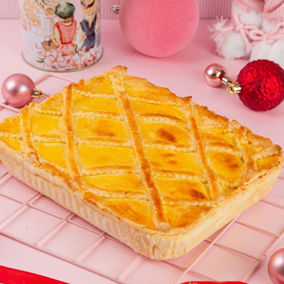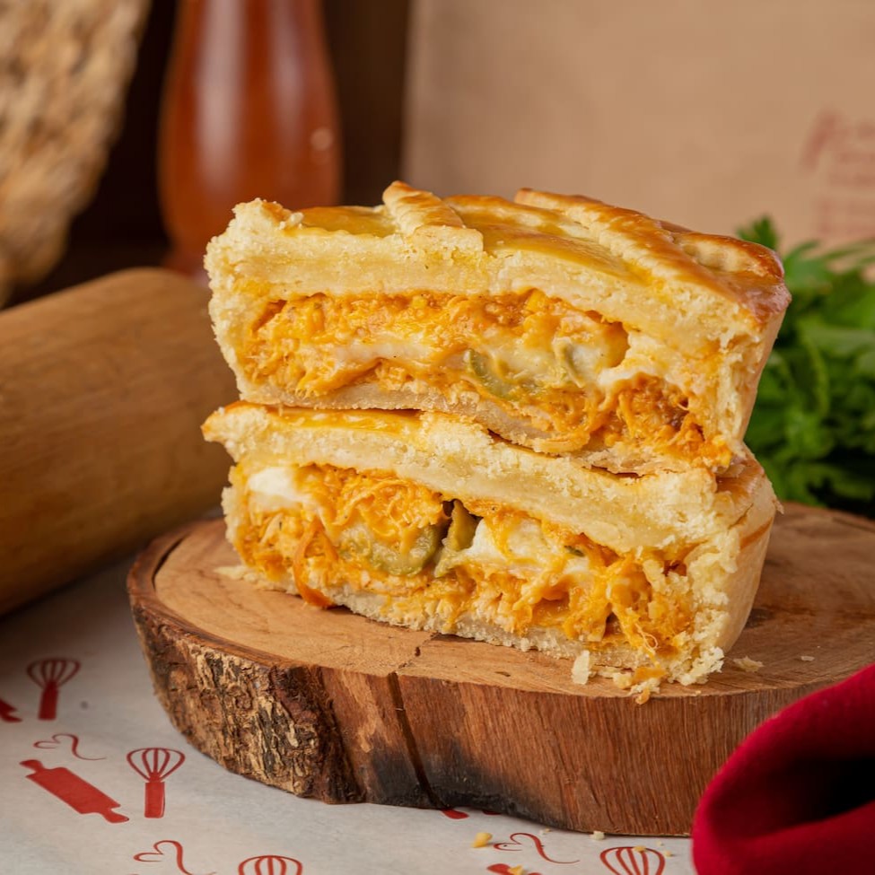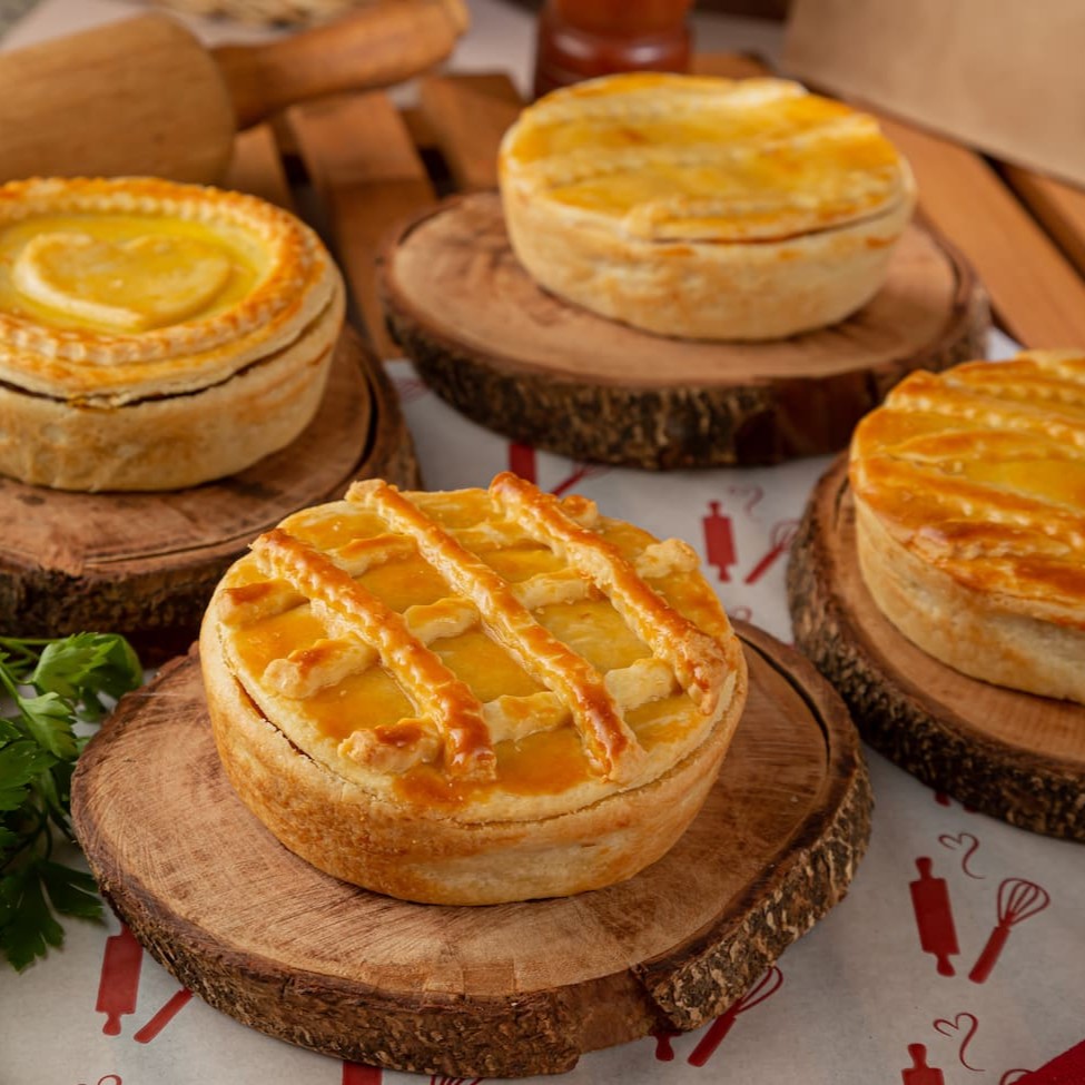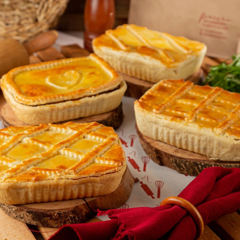 Delicioso empadão com massa caseira, crocante e sequinha, recheado com frango suculento e requeijão cremoso.
