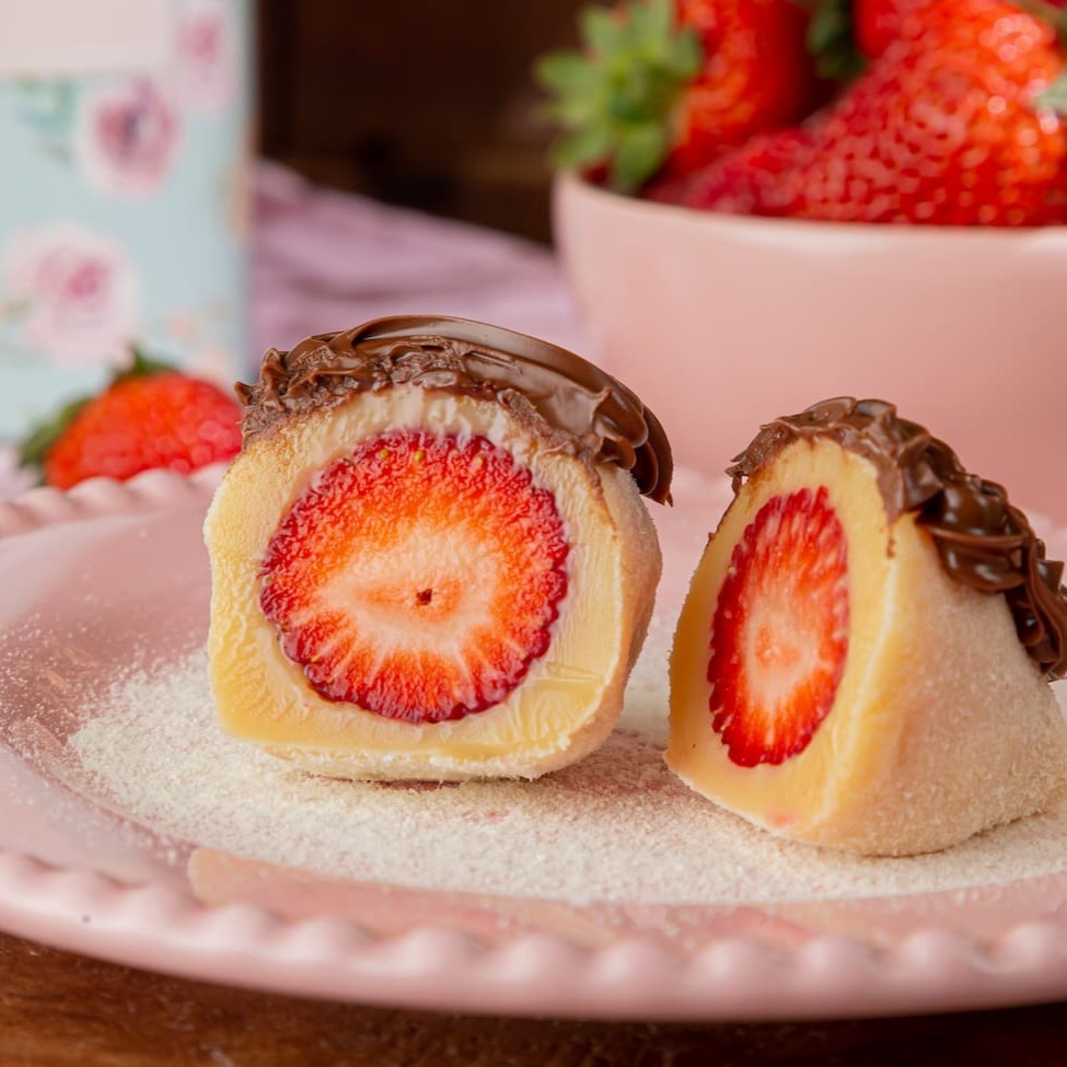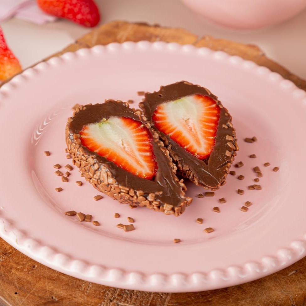 Deliciosa coxinha feita com brigadeiro de cacau, recheada com morango e coberta com granulado de chocolate ao leite.
