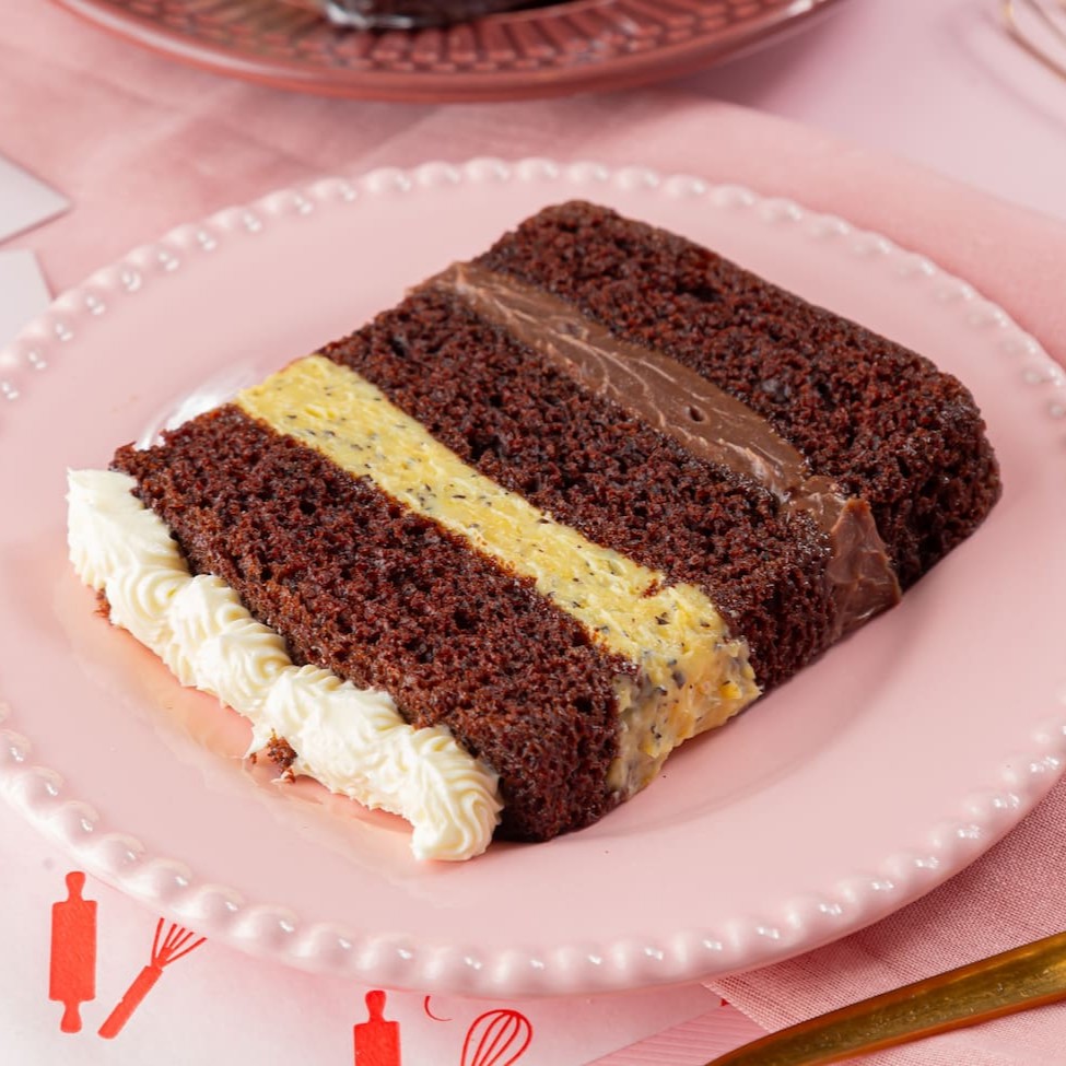 Deliciosa fatia do nosso bolo festivo. Massa fofinha, recheio bem cremoso de brigadeiro de cacau e brigadeiro de Maracujá, coberto com nosso famoso buttercream abrasileirado.