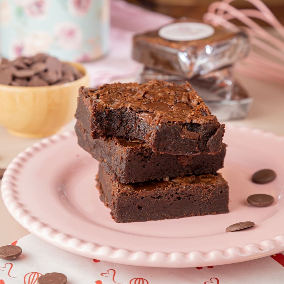 Delicioso brownie gourmet de massa molhadinha e suculenta com pedaços de chocolate e casquinha crocante por fora.