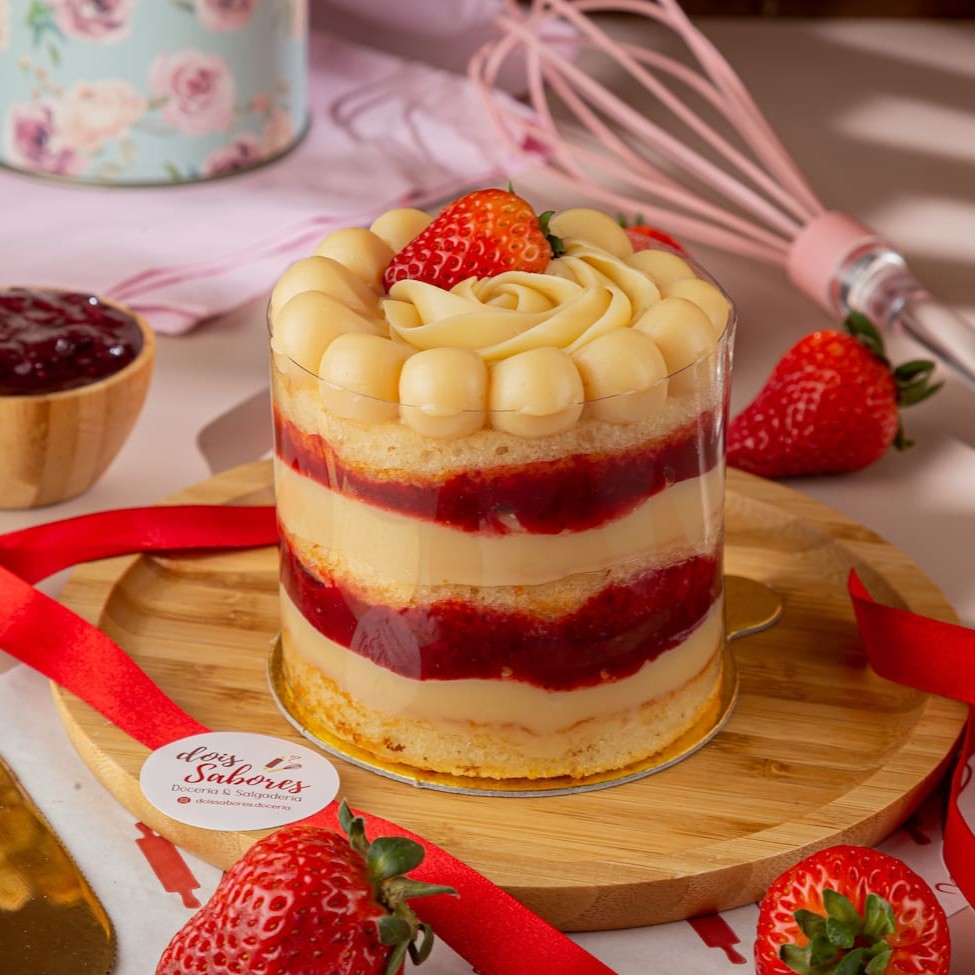 Saboroso Mini Bolo de massa fofinha que derrete na boca recheado com delicioso brigadeiro de Ninho com geleia artesanal de morango, embalado no acetato. Perfeito para pequenas comemorações ou presentear alguém especial!
