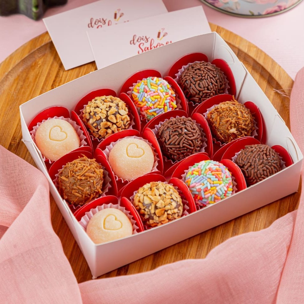 Caixinha com 12 brigadeiros variados: brigadeiro tradicional, leite Ninho, brigadeiro com amendoim, Ninho com confeite colorido e beijinho de coco. Não Fazemos Alterações De Sabores!
