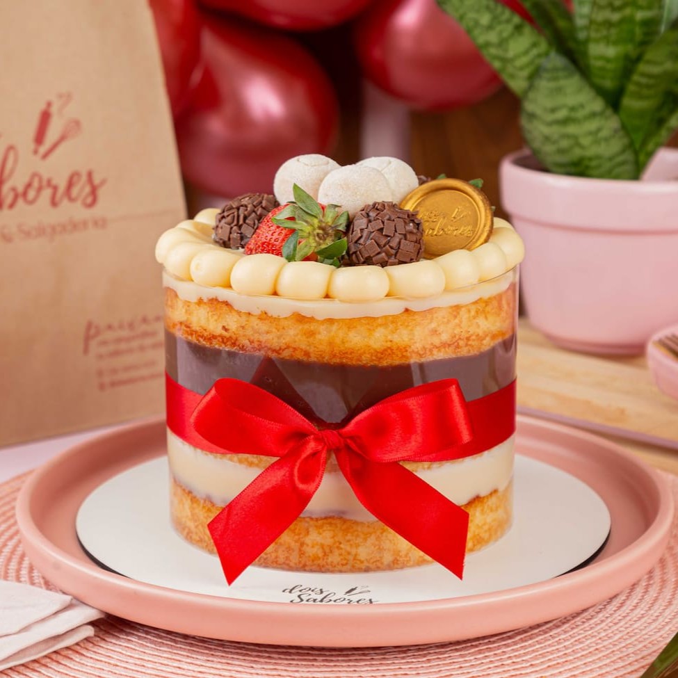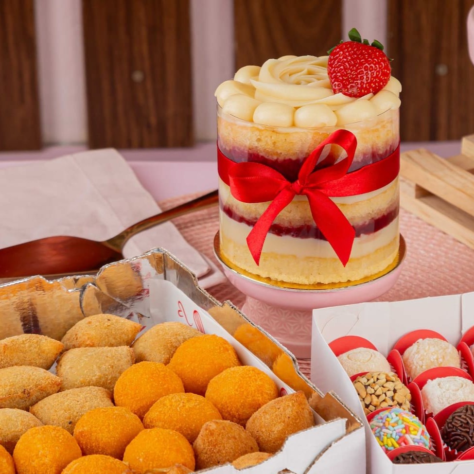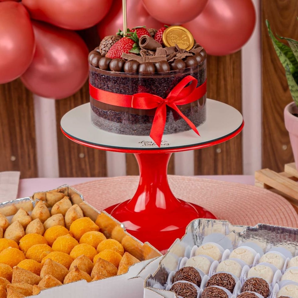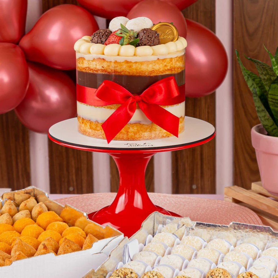 Kit Festa para 8 pessoas, composto por: - 1 Bolo Naked Cake Pp no acetato, 15cm com aprox. 1 kg, escolha a opção de sabor; - 60 mini salgados sendo: 20 Coxinha, 20 croquete milho e queijo, 20 travesseirinho de carne; - 25 docinhos de festa sendo: 13 Brigadeiro tradicional, 12 leite Ninho. Não É Possivel Fazer Alteração De Sabor!