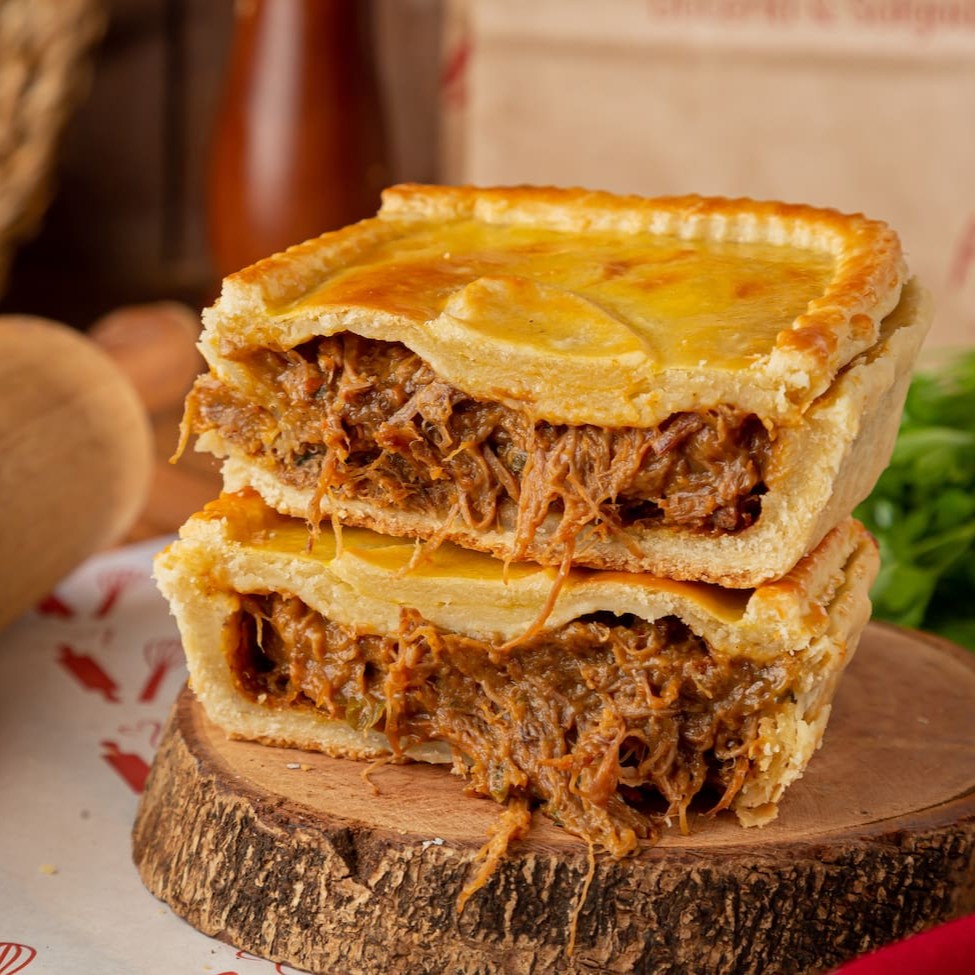 Delicioso empadão com massa caseira, crocante e sequinha, recheado com carne de panela cozida, cremosa e desmanchando de gostoso!