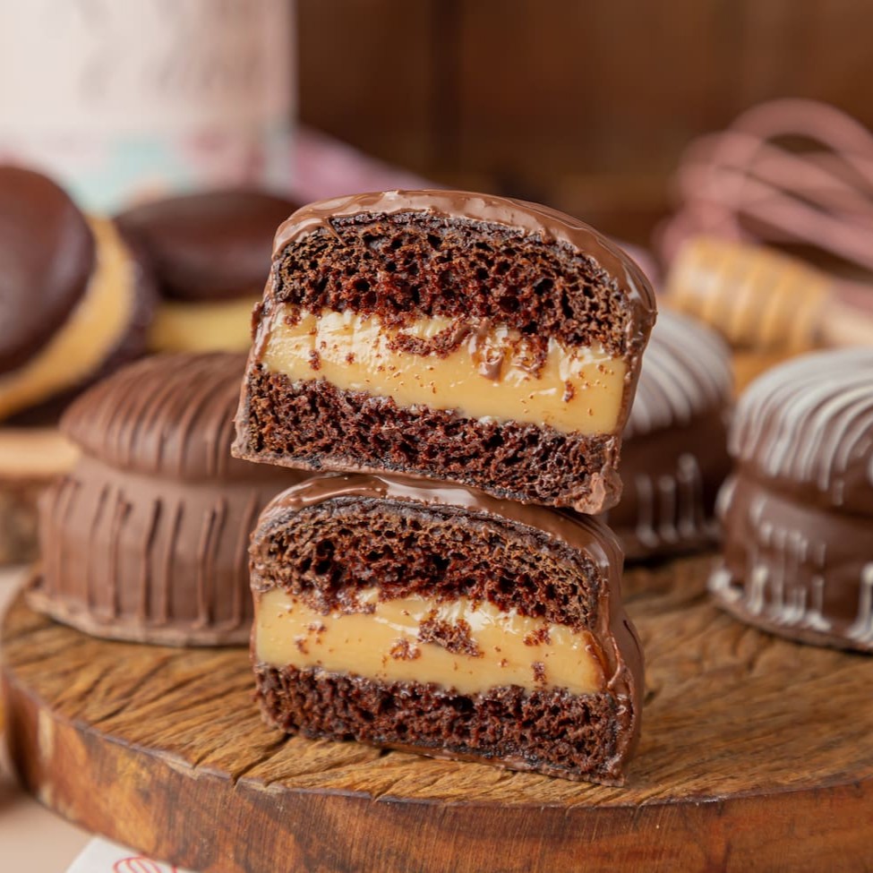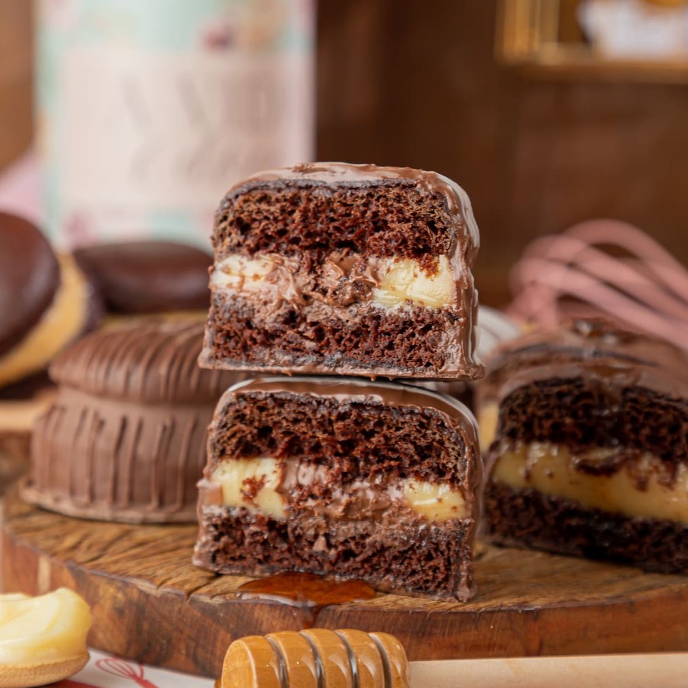 Saboroso Pão de Mel, massa fofinha com aroma de especiarias, generosa camada de recheio de doce de leite e coberto com uma fina casquinha de chocolate.