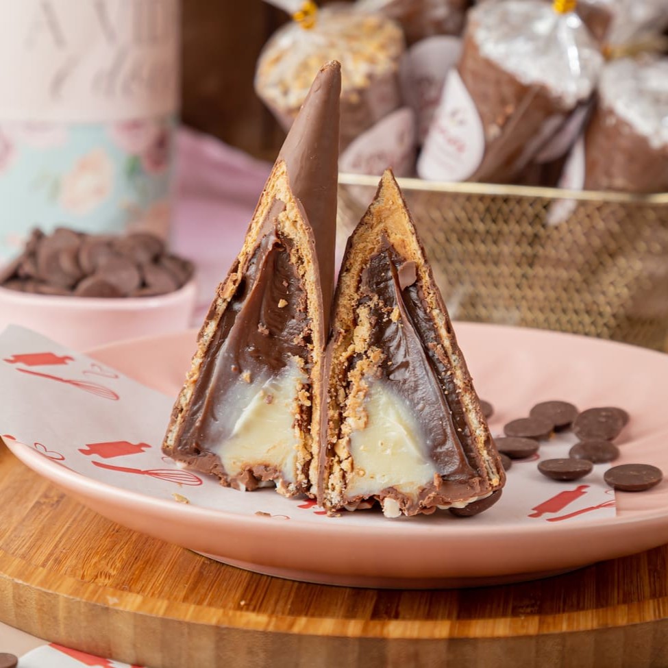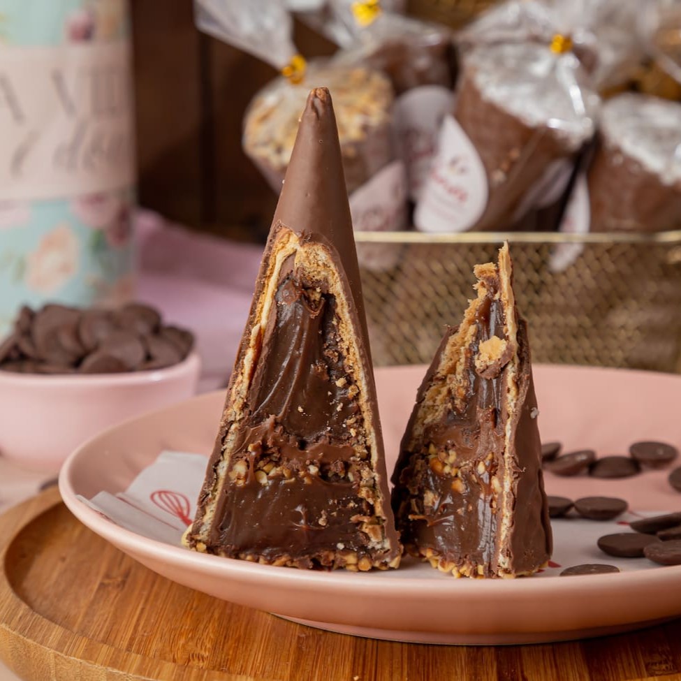 Casquinha de biscoito doce (cone) crocante completamente banhada no chocolate blend recheado com brigadeiro de cacau e brigadeiro de Ninho.