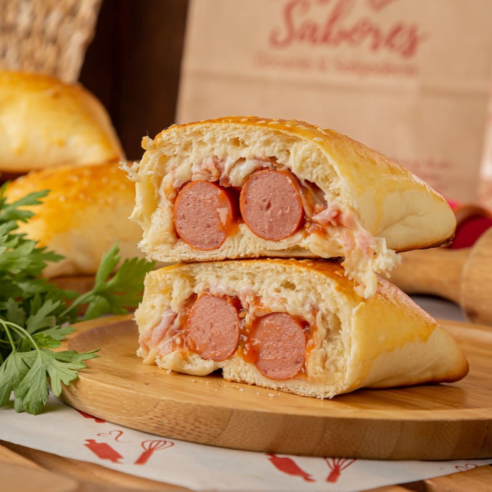 Massa caseira e fofinha, feito com salsichas suculentas acompanhadas de presunto e mussarela e molho de tomate com pedaço.