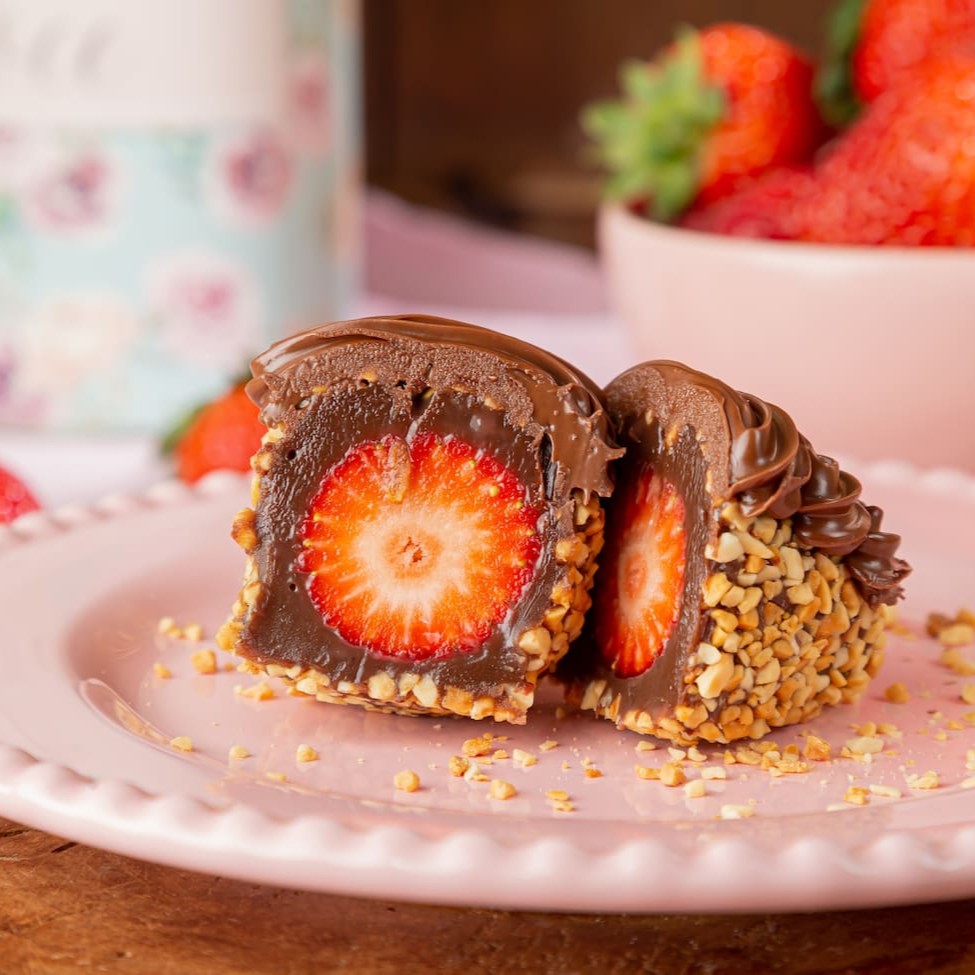 Deliciosa coxinha feita com brigadeiro de cacau, recheada com morango, coberta com granulado de amendoim e Nutella.
