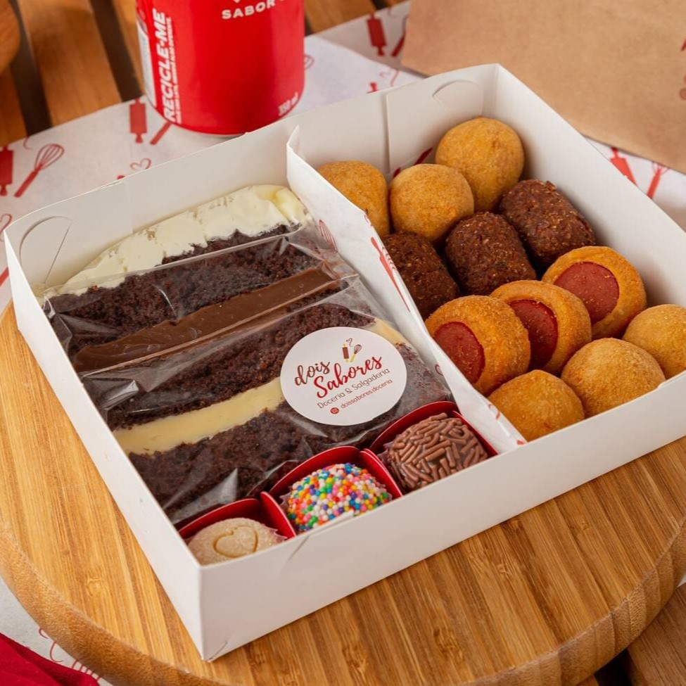 Kit Festa para 3 pessoas, composto por: - 1 Mini bolo, 10cm com aprox. 500g; escolha a opção de sabor; - 30 mini salgados sendo: 10 Coxinha, 10 croquete milho e queijo, 10 travesseirinho de carne; - 12 docinhos de festa sendo: 3 Brigadeiro tradicional, 3 leite Ninho, 3 brigadeiro com amendoim, 3 beijinho de coco. Não É Possivel Fazer Alteração De Sabor!
