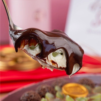 Irresistível e super refrescante! Recheada com brigadeiro branco cremoso e uvas verdes frescas, finalizada com calda de chocolate. Uma combinação leve, doce e surpreendente em cada pedaço.