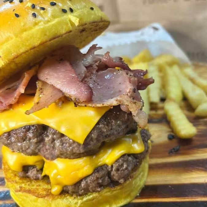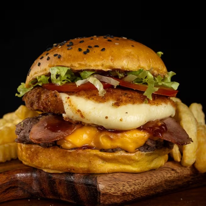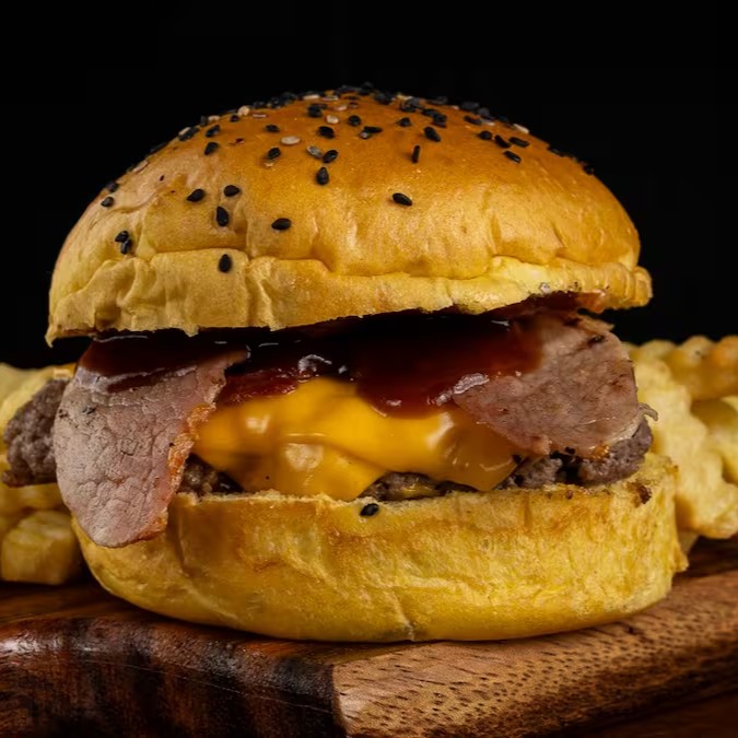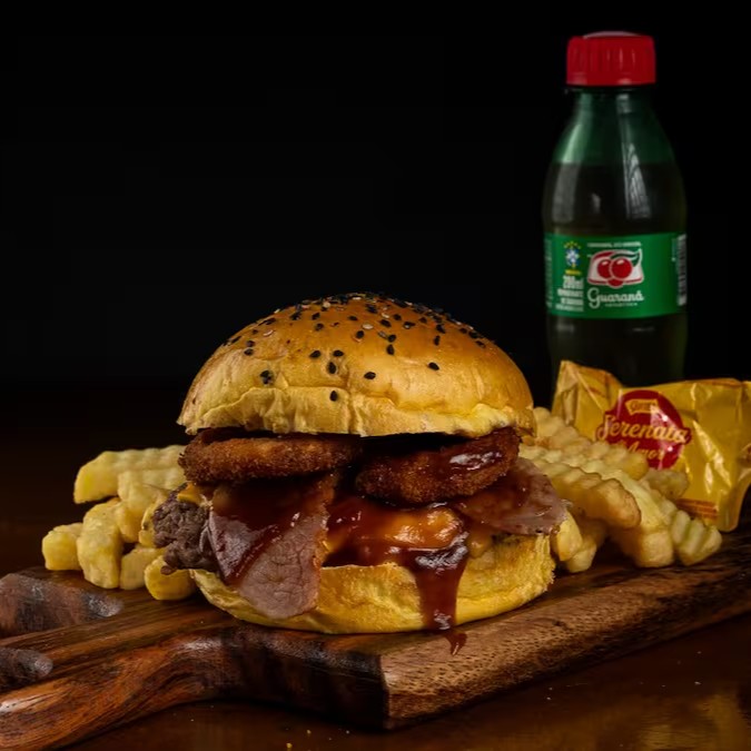 Pão brioche com gergelim preto, blend sulento 120gr, queijo cheddar, bacon, molho barbecue e anéis de cebola empanados.
