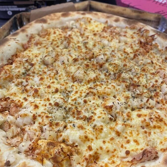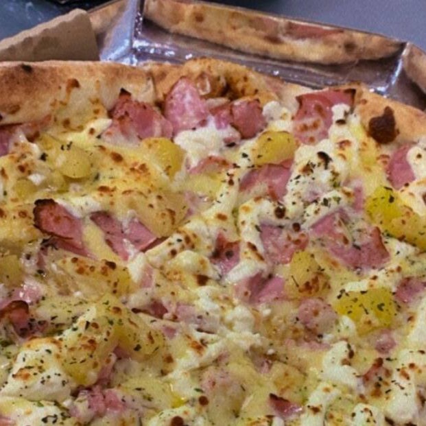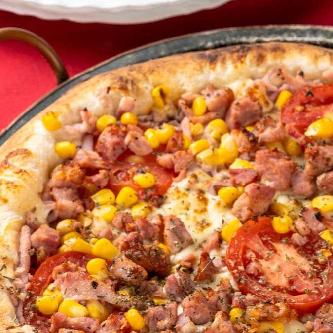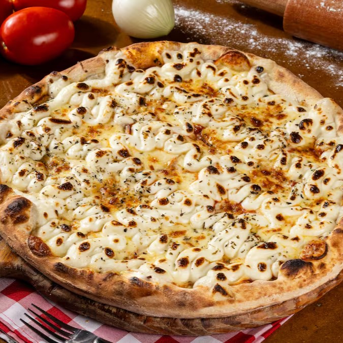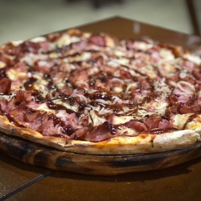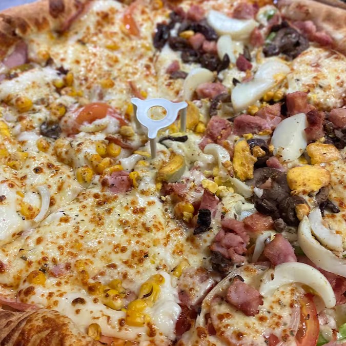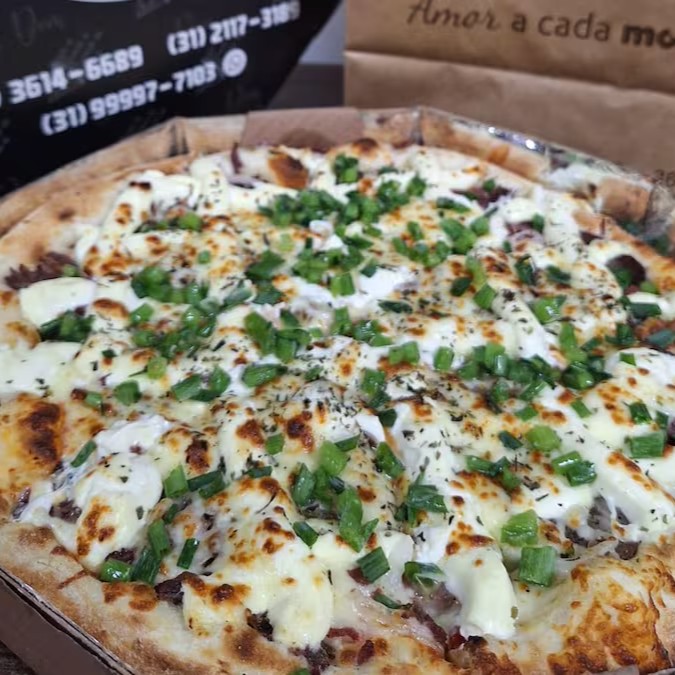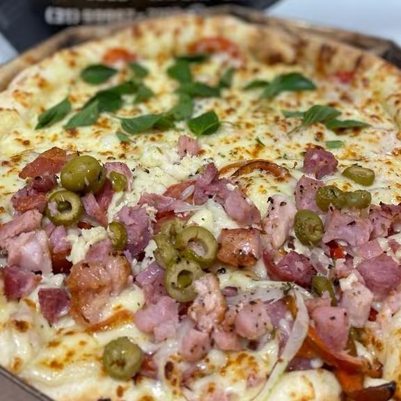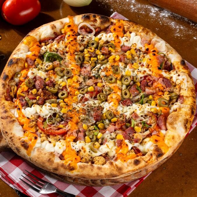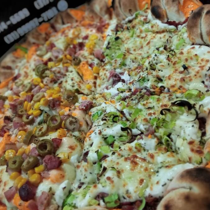 Muçarela, cvatupiry, cheddar, presunto, calabresa, frango, milho, bacon, cebola, pimentão e tomate.