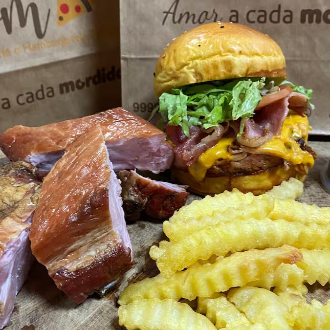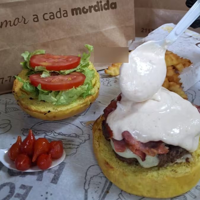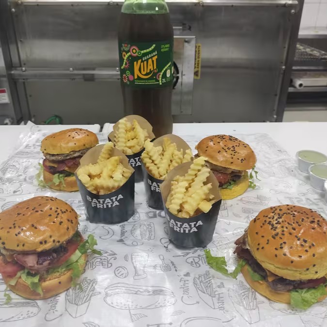 Cada hambúrguer acompanha 100g de batatas fritas e 1 pote de molho verde da casa