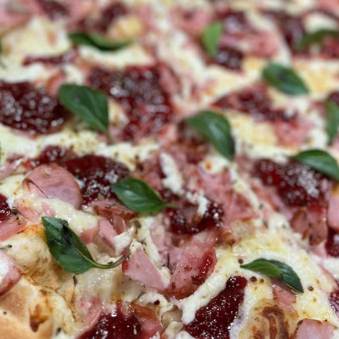 Muçarela, cream cheese, lombinho canadense, geleia de morango e manjericão.