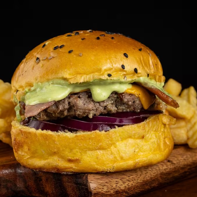 Pão brioche com gergelim preto, blend suculento 120g, queijo cheddar, cebola roxa, alface,tomate e molho verde da casa.