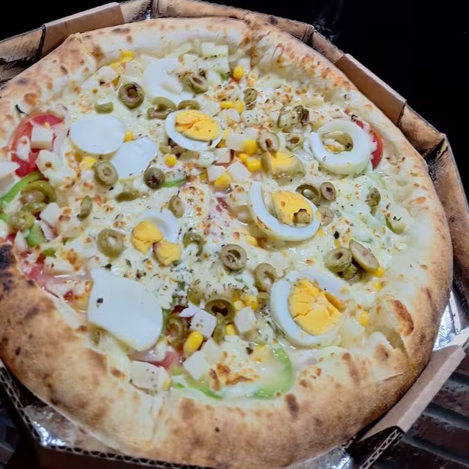 Muçarela, palmito, azeitona, tomate, pimentão, ovo, milho e cebola.