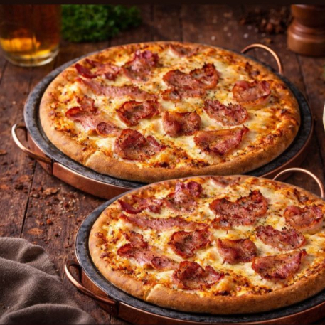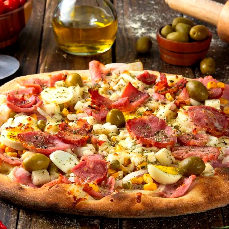 MASSA, MOLHO POMODORO, MUSSARELA, CALABRESA, CEBOLA, BACON, AZEITONA, TOMATE,