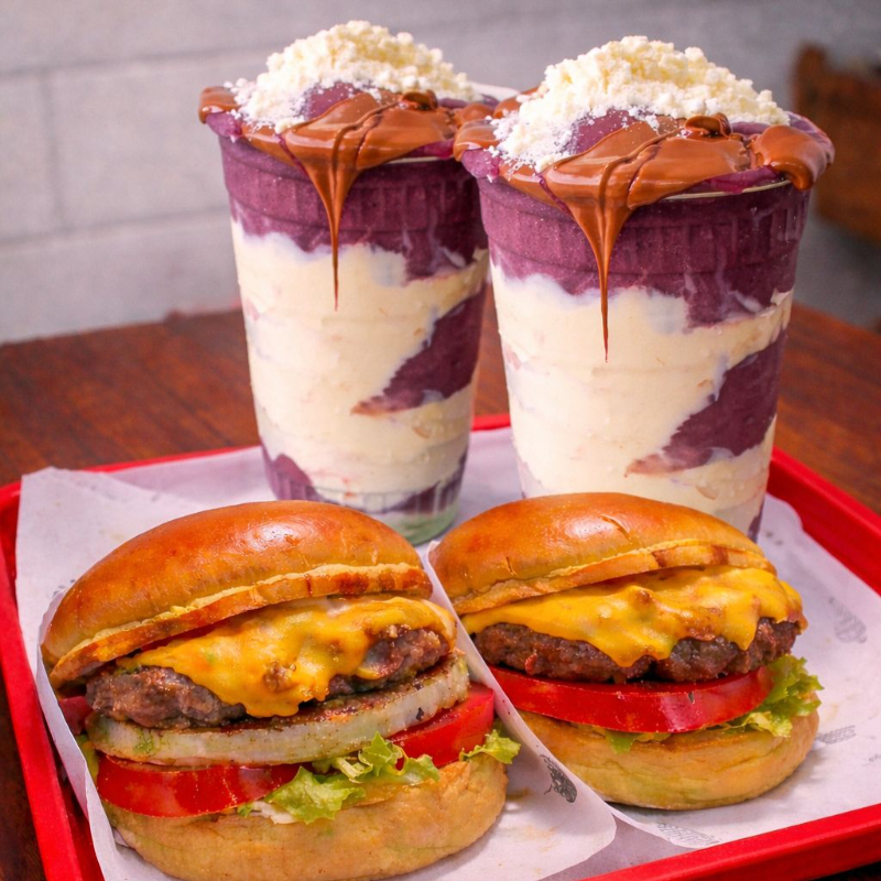 Hambúrguer carne 120g de picanha cheddar e bacon + 2 açaí de 500ml creme de avelã com ninho e leite em pó