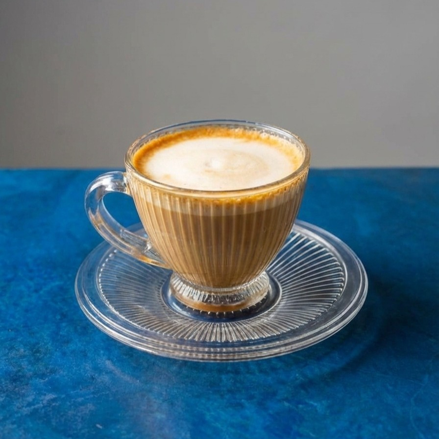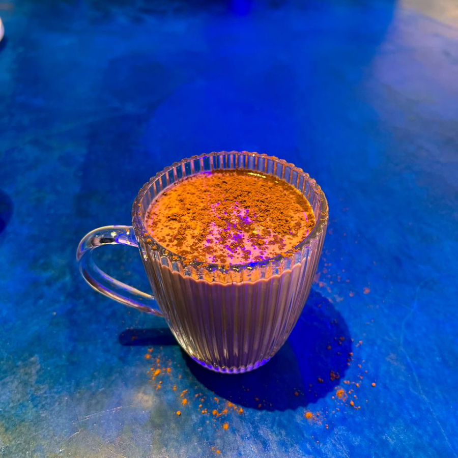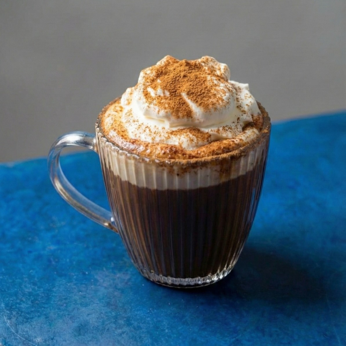 Dose de espresso, leite vaporizado, ganache de chocolate, chantilly e canela