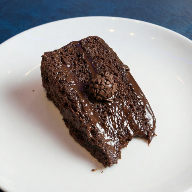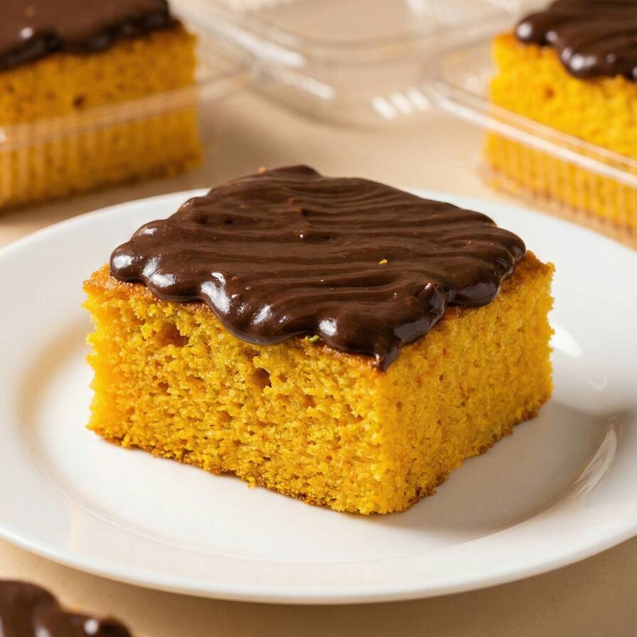 Nosso bolo de cenoura caseiro, coberto com uma deliciosa ganache de chocolate