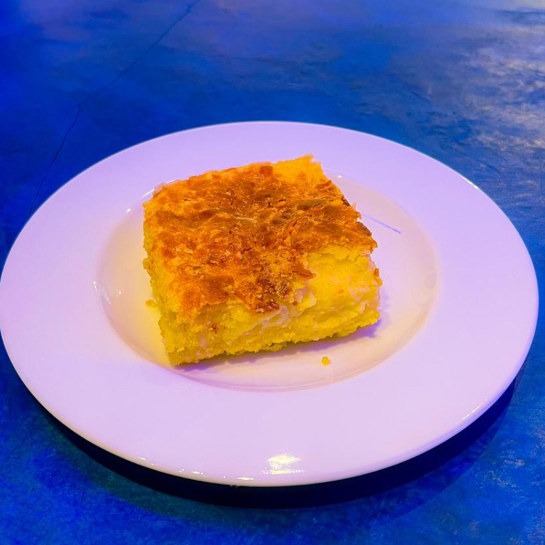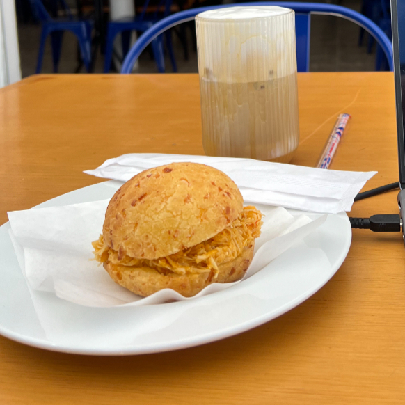 Pão de queijo da casa, 2 fatias de pão na chapa, 2 ovos mexidos com bacon fatia, porção do nosso creme de queijo canastra, salada de frutas do dia com granola e mel + bolo do dia. Acompanha suco de laranja (400ml) e flat white (180ml). Para esse brunch a indicação da casa de bebida é o um dos nosso Matchá ou um Dopeccino.