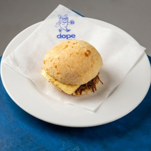Pão de queijo recheado com creme de queijo canastra, carne de panela da casa e rúcula