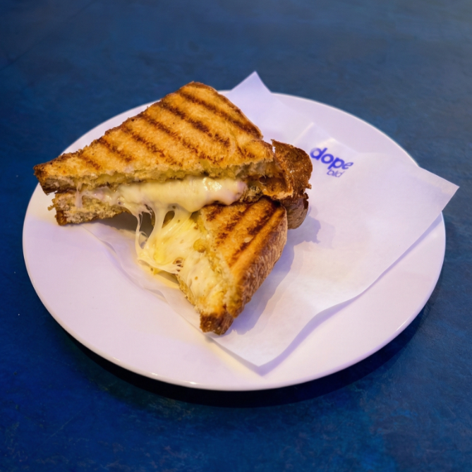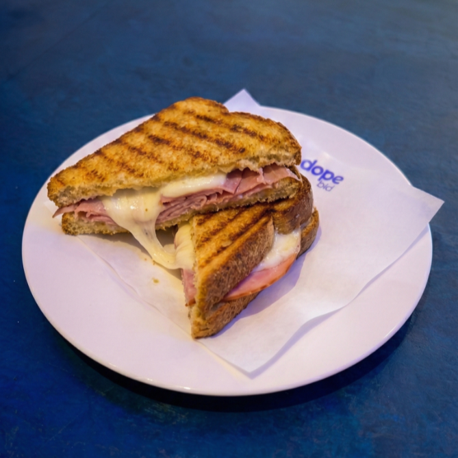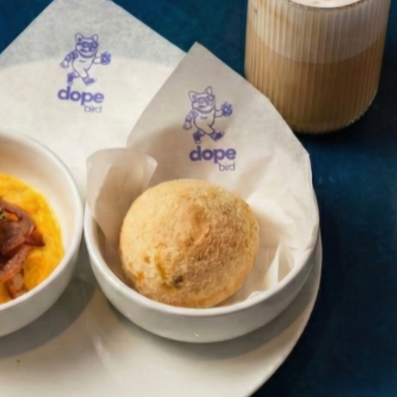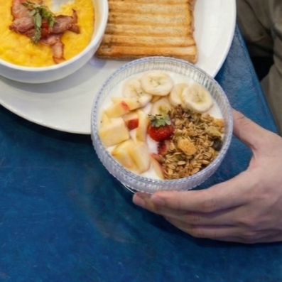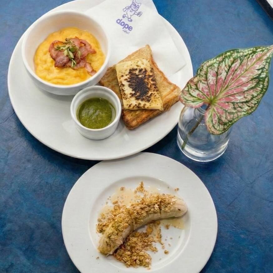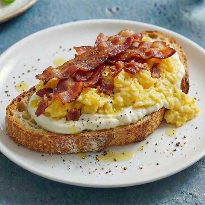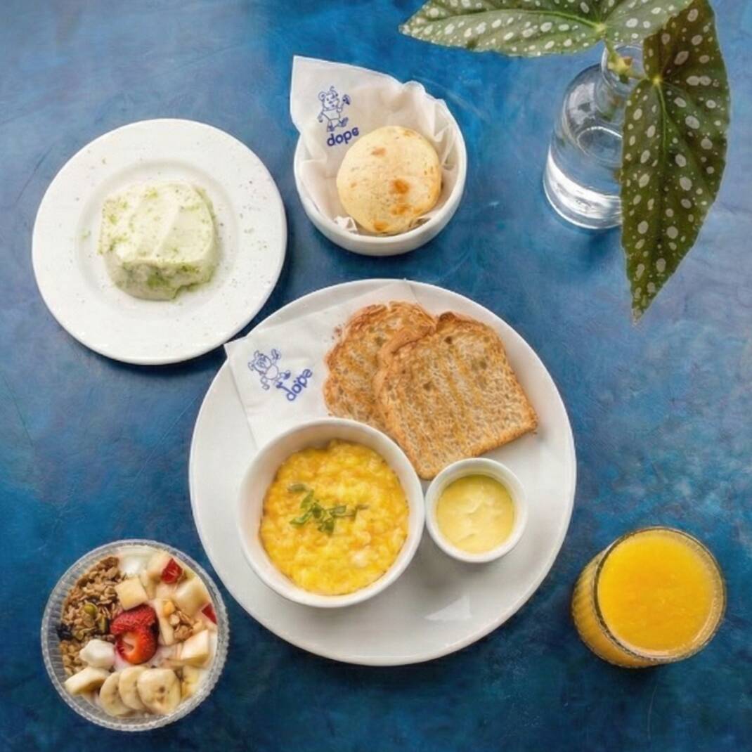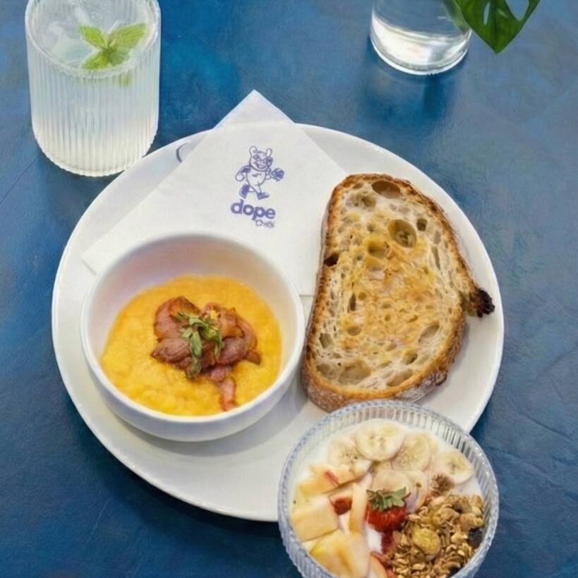 Toast (pão sourdough) na chapa com manteiga, ovos mexidos com duas fatias de bacon, yogurt grego com frutas do dia e granola zero, Acompanha limonada da casa. Para esse brunch a indicação da casa de bebida é o Capuccino Brasileiro ou um Dope Protein Smoothie.