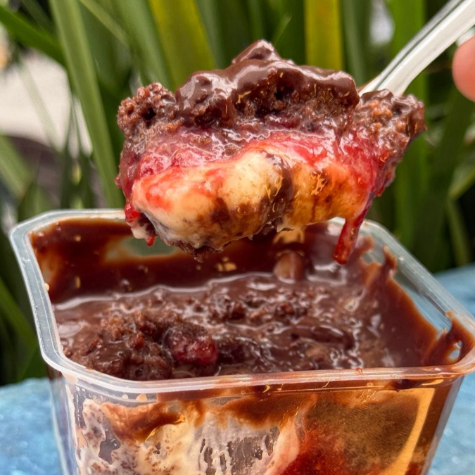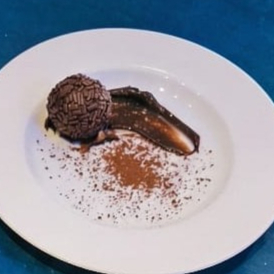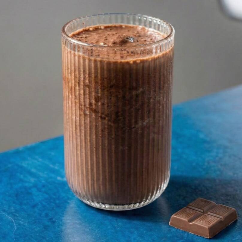 Banana congelada, ganache de chocolate, whey (24grs de proteína) cacau e leite s/ lactose.