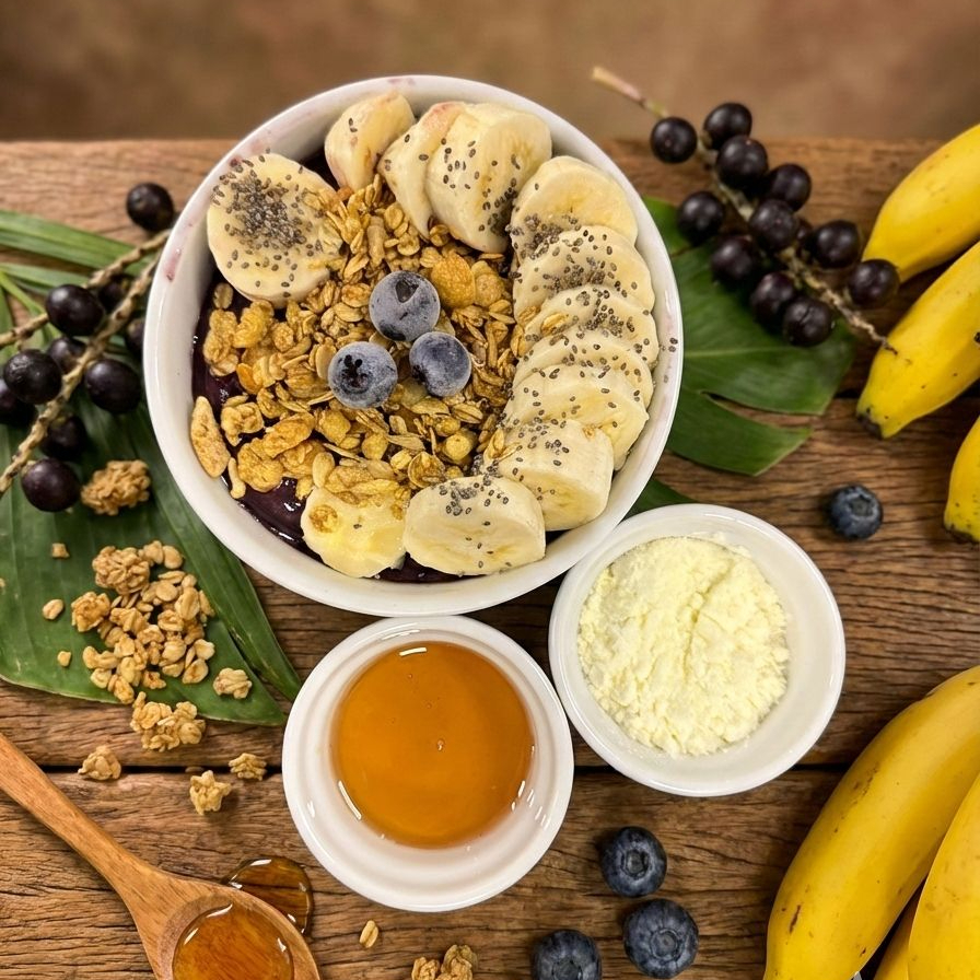Açaí de 300Ml, banana, chia, morango, granola, leite em pó e mel