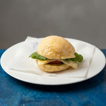 Pão de queijo recheado com tomate confit, muçarela bufula, e pesto da casa