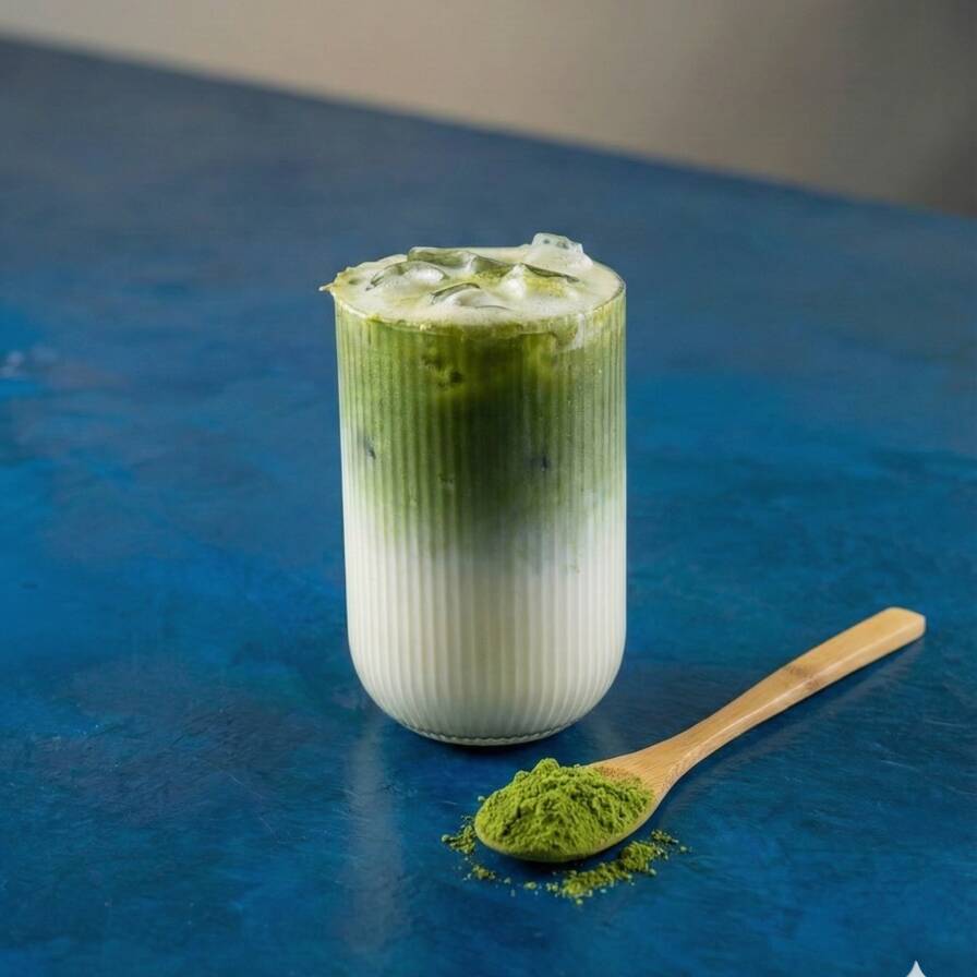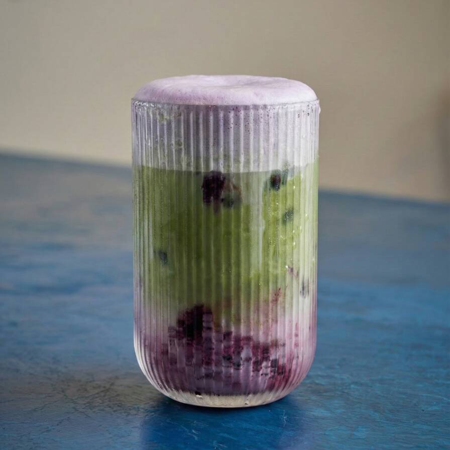 Matchá, leite vegetal e calda de frutas vermelhas caseira