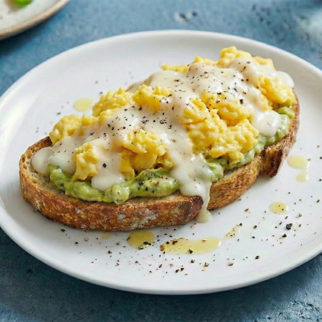 Pão de fermentação natural, pasta abacate, ovos mexidos, molho parmesão