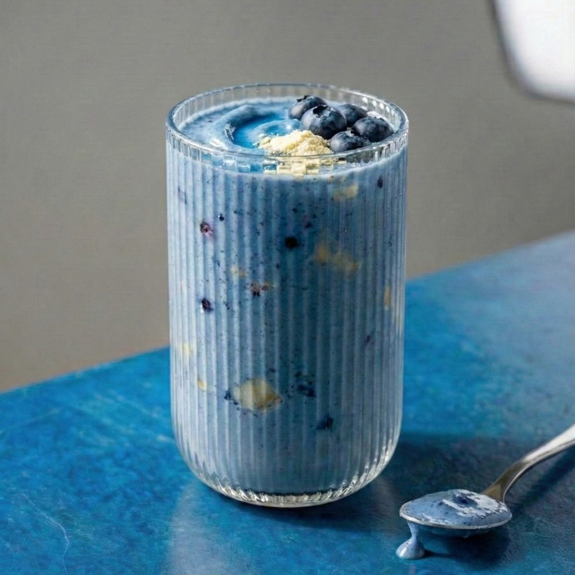 Mirtilo, banana congelada, whey (24grs de proteína) de baunilha e leite s/lactose com infusão de chá de fada azul (não traz gosto, é uma infusão rica em antioxidantes, conhecida por sua cor azul intensa natural. Possui propriedades calmantes, anti-inflamatórias e anti-idade)