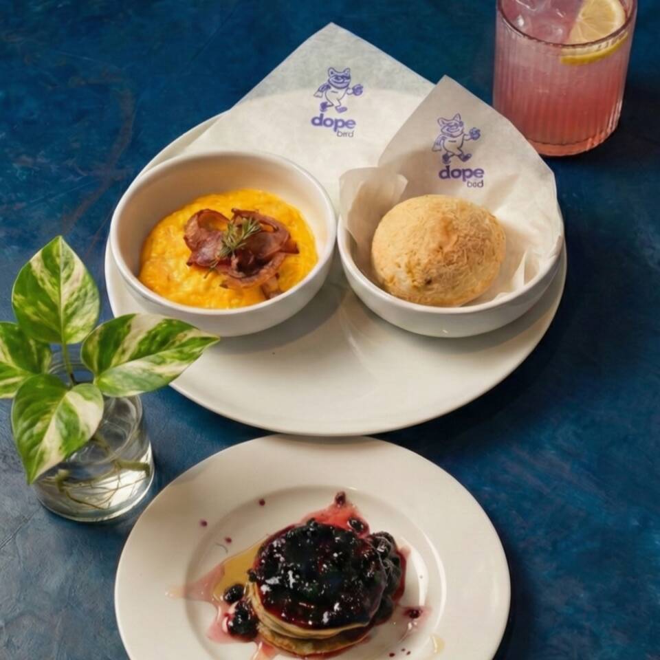 Nosso pão de queijo com queijo canastra, dois ovos mexidos, 4 discos de panqueca (doce) com mel e geleia de frutas vermelhas da casa. Acompanha Limonada rosada (400ml). Para esse brunch a indicação da casa de outras bebida é o Dope Iced Caramel e/ou Capuccino Brasileiro.